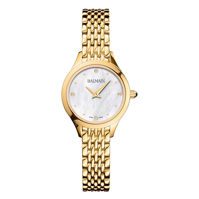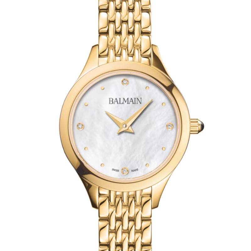 De forme ronde, ce cadran se parant d'un fond en nacre blanche vous accordera une agréable lisibilité horaire. Son pourtour est longé par des index de couleur dorée, dont quatre d'entre eux sont sertis de diamants blancs Top Wesselton VS-SI de 0,015 carat. Ces pierres apportent une touche de luxe à cette montre pour femmes. Le centre de cadran comprend deux aiguilles dauphines qui oscillent afin de vous communiquer les heures et les minutes. Pour finir, Balmain a choisi de signer sa création en dessous de l'index de midi et d'apposer le lieu de fabrication à 6 heures.