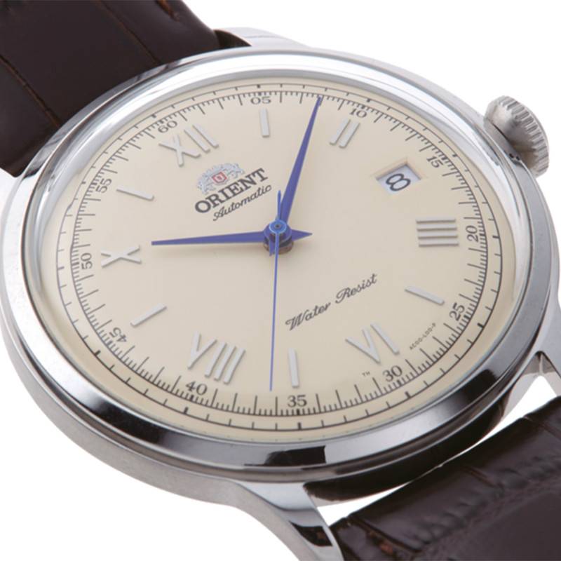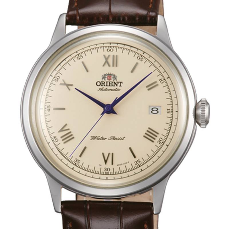 Ce garde-temps Bambino V2 arbore un cadran beige avec des aiguilles bleutées, une combinaison qui donne tout son charme à cet ensemble. Un chemin de fer contenant de traits et de chiffres arabes par intervalles de 5, se placent sur le pourtour du cadran pour faciliter la lecture de minutes et secondes. Pour marquer les heures, des chiffres romains sont affichés dans une séquence de nombre pair (2, 4, 6, 8, 10 et 12), accompagnés d'index bâtons qui marquent les heures impaires. Vous remarquerez qu'à 4 heures le numéro romain "IV" a été remplacé par "IIII" et cela est simplement pour donner de la symétrie au cadran. La date vous est fournit au travers d'un guichet au fond blanc placé à 3 heures. Les aiguilles bleutées toutes fines rappellent les montres classiques du passé et vous procurent un voyage perpétuel dans le temps. Finalement, à 12 heures, la maison japonaise signe avec son nom et son logo sa création.