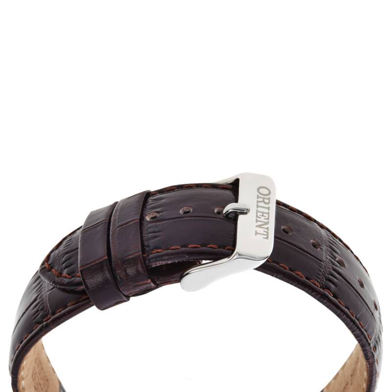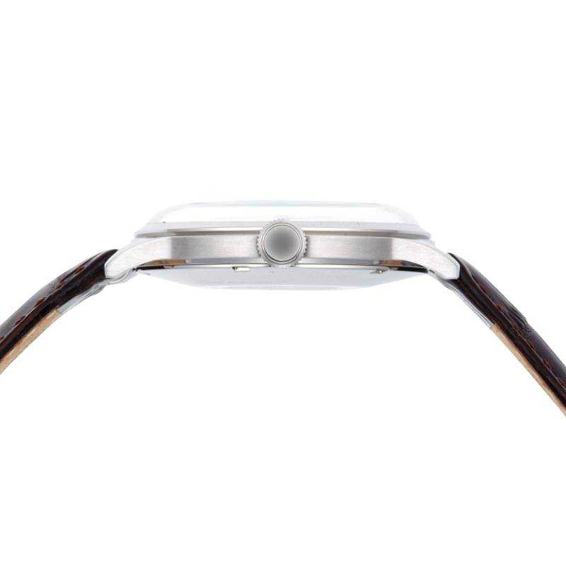 Ce modèle possède un bracelet en cuir marron foncé indémodable et intemporel. Il est embossé motif crocodile et présente des surpiqûres apportant un léger contraste. Vous pouvez l'ajuster à votre poignet à l'aide de sa boucle ardillon argentée gravée du nom de la marque.