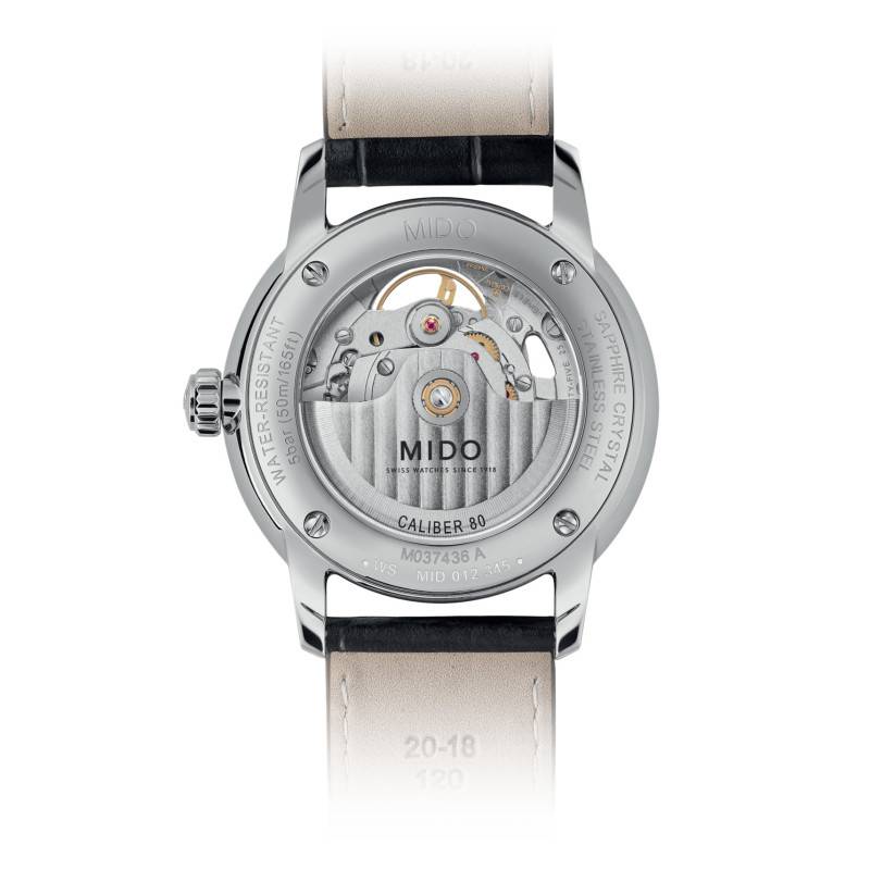 Chic et intemporel, cette montre suisse accueille un mouvement automatique Mido Calibre 80 agrémenté d'un spiral en Nivachron qui permet de réduire l'effet des champs magnétiques. Ce mécanisme possède 25 rubis et assure une réserve de marche de 80 heures.
