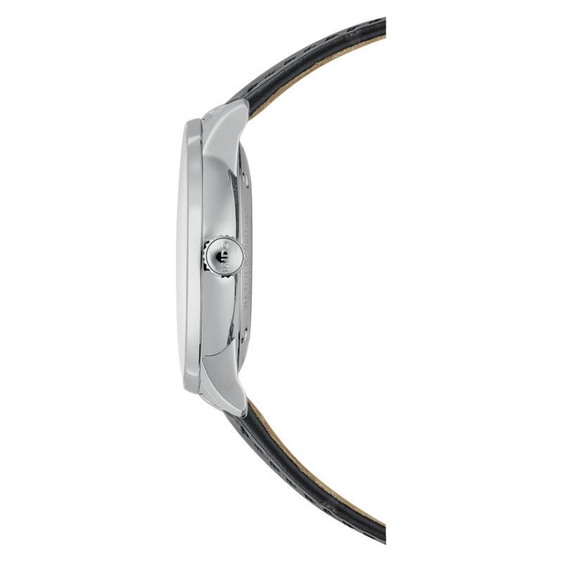 Cette montre dispose d'un charmant bracelet de 20 mm de largeur fait en cuir de vachette. Apportant à cette élégante montre suisse un look épuré, sa finition crocodile et sa couleur noire sont en parfaite harmonie avec la couleur argentée de la boucle ardillon.
