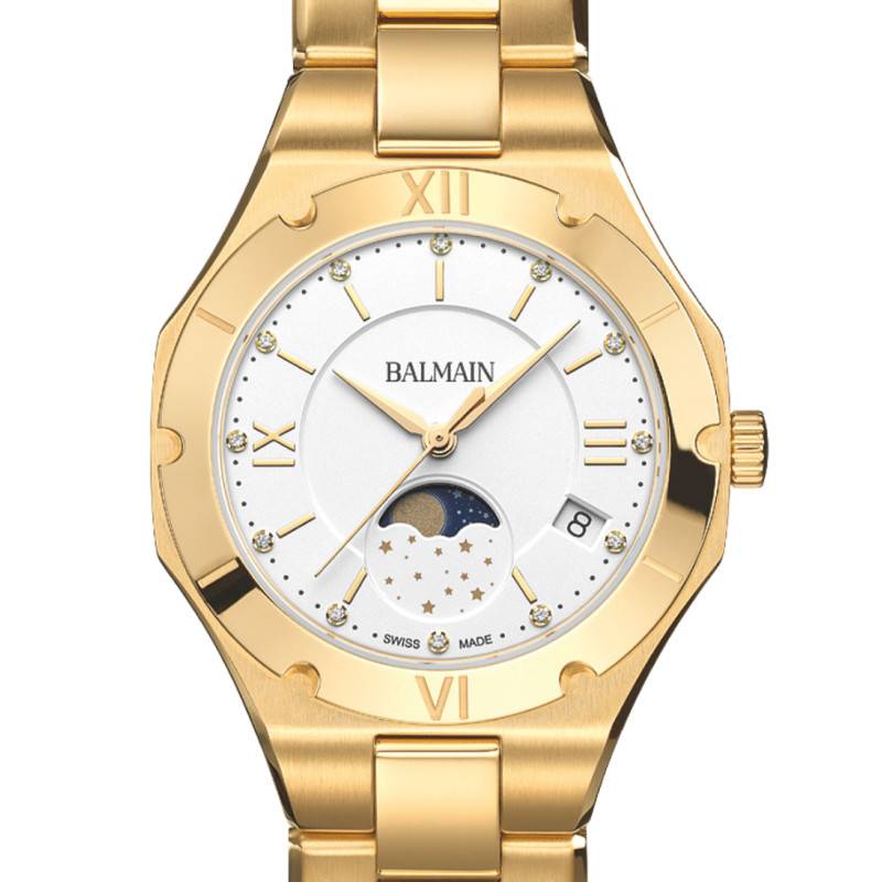 Inspirées du monde de la mode, les montres Balmain ont pu rencontrer un succès grandissant grâce à leur capacité à mêler l'excellence de l'horlogerie suisse et l'esthétique de la haute couture. Cette marque incontournable continue à montrer toute l'étendue de son expertise en proposant des montres à la fois performantes et élégantes en vogue, signées “Swiss Made”. Elle vous présente ici un modèle sophistiqué et resplendissant destiné à parer le poignet d'une femme stylée. Cette montre Be Balmain B45903322 est le choix idéal pour une allure distinguée de jour comme de nuit. Elle magnifiera vos tenues aussi bien chics que branchées en apportant la touche d'élégance finale à votre look. Son boîtier en acier inoxydable prend une forme octogonale de 33 mm de diamètre et se pare d'un revêtement PVD jaune mis en valeur par une finition polie/brossée. Agréable à porter, il pèse 110 gr et dévoile une lunette dorée marquée par des demi-cercles ajourés, par des chiffres romains à 6h et 12h et par des bâtons ciselés. Celle-ci entoure un verre saphir plat qui couvre le cadran afin de le protéger contre l'usure quotidienne. Fidèle à la tradition horlogère, une couronne crantée s'installe à 3h servant au réglage et au remontage manuel des aiguilles et du guichet. Au verso, le fond de boîte garantira une étanchéité de 50 mètres de profondeur.