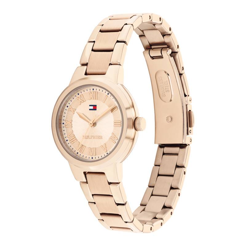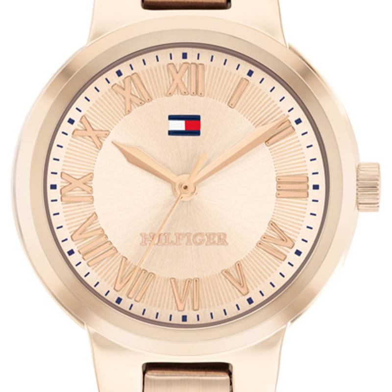 La montre de la marque Tommy Hilfiger présente un boîtier rond confectionné en acier inoxydable de couleur or rose, alliant élégance et durabilité. Avec ses dimensions de 28 mm de diamètre et 7 mm d'épaisseur, elle offre une présence discrète mais affirmée sur le poignet féminin. Son poids de 58 g en fait une montre légère et confortable à porter au quotidien. Le boîtier est surmonté d'une lunette en acier, également en finition rose, qui protège délicatement le verre minéral.