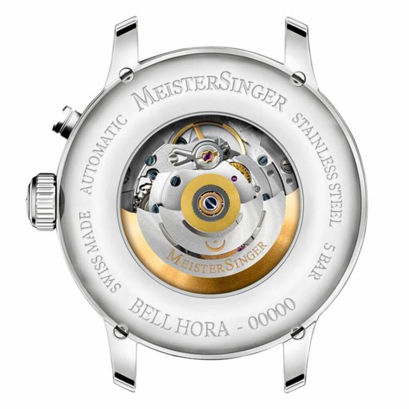 Avec la Bell Hora, MeisterSinger présente, à l'occasion du 20e anniversaire de la maison allemande, une montre à une aiguille avec une Sonnerie au passage qui retentit à chaque heure pleine. Effectuant deux révolutions complètes de cadran pour indiquer l'heure sous un format 24h, la lecture du temps qui passe trouve une nouvelle façon originale de se faire, le tout avec élégance pour contenter les gentlemen aux tenues les plus habillées. Son boîtier est réalisé en acier inoxydable et propose un diamètre de 43 millimètres associé à une épaisseur de 13 millimètres. Plus grand pour correspondre aux besoins du marché en terme de dimensions, ce modèle reste d'une certaine finesse pour conserver sa grâce et son design quelque peu vintage qui fait sa force. C'est un verre saphir de forme bombée qui vient équiper ce modèle tandis que la fond de boîte est vissé.