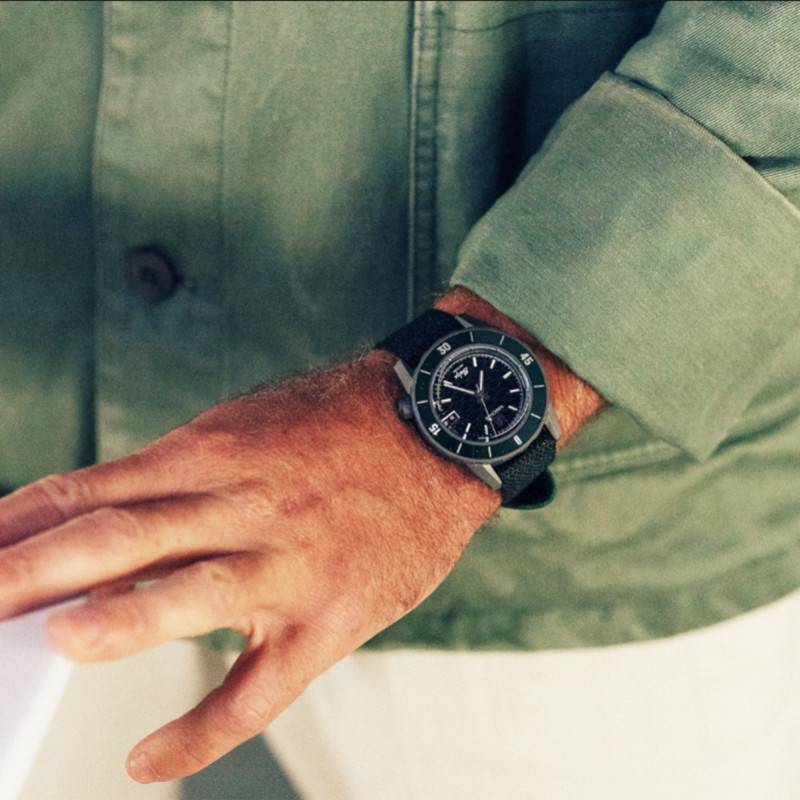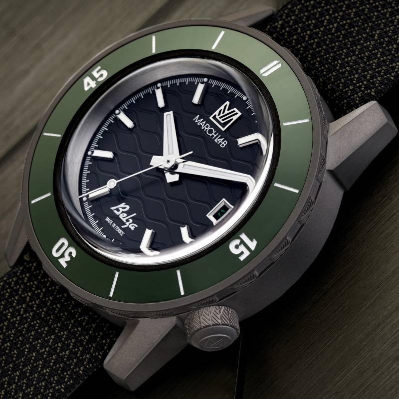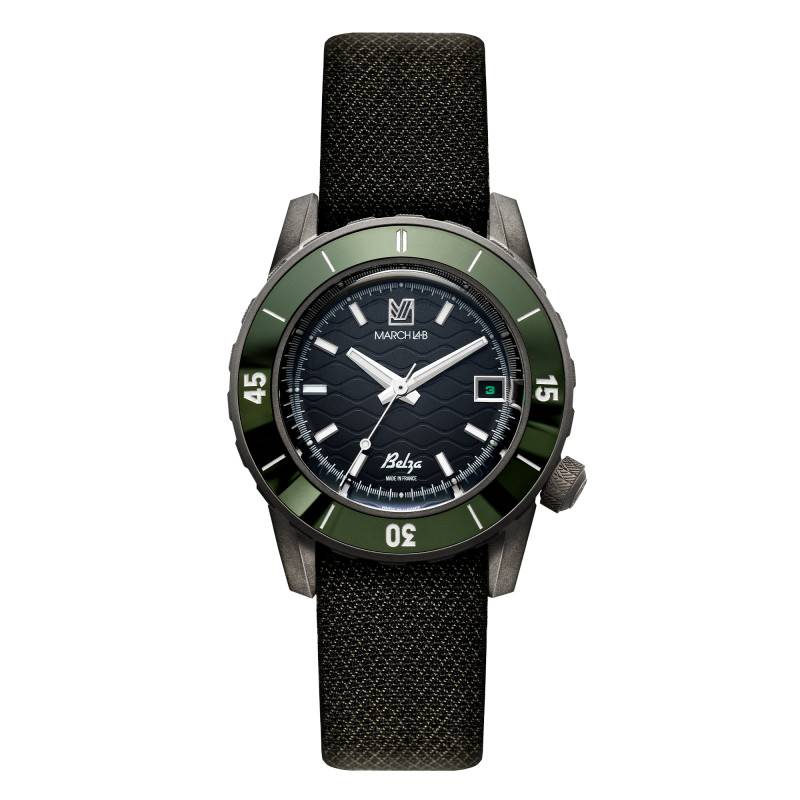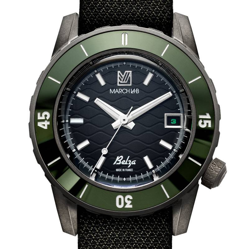 La montre Belza Titane Edition Limitée à 99 pièces de March LAB est une pièce maîtresse d'ingénierie horlogère, conçue pour combiner style, durabilité et précision. En tant que modèle destiné aux amoureux de la mer et aux amateurs de défis aquatiques, son design audacieux se reflète dans son boîtier rond fabriqué en titane brossé, finement taillé pour offrir une résistance incroyable à la corrosion et aux chocs. Avec un diamètre de 40 mm et une épaisseur de 14,50 mm, elle s'ajuste parfaitement au poignet, offrant confort et robustesse. Son allure est accentuée par une lunette en céramique verte, rotative et uni-directionnelle, une caractéristique indispensable pour garantir la sécurité dans les environnements maritimes. Ce garde-temps, fabriqué et assemblé en France, se distingue par son style élégant et sportif, faisant de lui un accessoire parfait pour les hommes modernes soucieux du détail et de la performance.