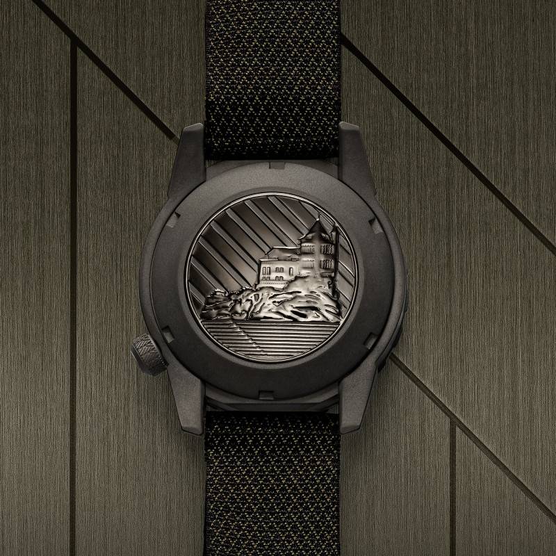 Le cadran de cette montre est un véritable joyau de design fonctionnel. De couleur noire avec une texture ondulée, il offre une profondeur visuelle impressionnante grâce à son traitement subtil qui reflète la lumière sous différents angles. Protégé par un verre saphir bombé avec traitement anti-reflets, le cadran est à la fois résistant aux rayures et extrêmement facile à lire sous tous les éclairages. Les index et aiguilles luminescents bénéficient du traitement SuperLuminova, s'illuminant dans l'obscurité pour assurer une lecture optimale de l'heure, quelle que soit la luminosité ambiante. Un guichet date intégré complète cette fonctionnalité, permettant à l'utilisateur de garder une visibilité sur le calendrier.