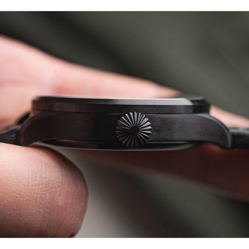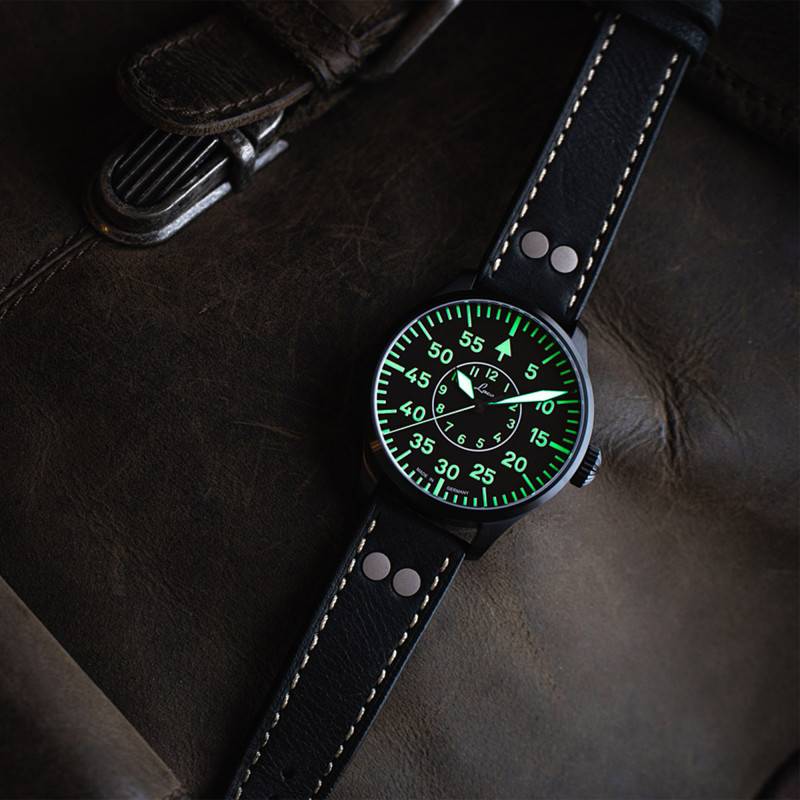 L'ADN de la marque et son esprit aviateur se retrouve pleinement dans la configuration et le style du cadran de cette montre automatique. Deux cercles se distinguent avec dans un premier temps des chiffres arabes marquant les heures, placés en position centrale. Dans un second temps, de plus gros chiffres arabes représentent les minutes en position périphérique. Avec eux se trouve des index bâtons ainsi qu'un chemin de fer des minutes clairement lisible. À la rencontre de ces marqueurs temporels viennent trois aiguilles rythmées par les heures, les minutes et les secondes. Il est important de préciser que chacun des éléments cités ci-dessus est doté d'un traitement Superluminova C3 qui vous garantit une bonne visibilité en toute situation.