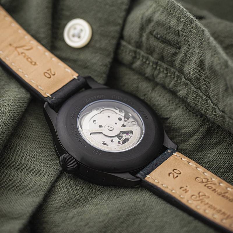 La marque allemande Laco lève le voile sur ce modèle automatique pour homme à l'allure définitivement aviatrice. Il est issu de la collection Pilot qui, comme toutes les collections de la marque, a été conçu dans le plus grand respect d'un savoir-faire artisanal. D'une qualité extrême et d'une précision optimale, ce garde-temps s'arme d'un design inspiré tout droit de l'univers aéronautique que connait bien Laco. Dans les années 40, ses montres auront servi à la German Air Force et ses pilotes. En plus d'une robustesse assurée, le mariage de l'acier inoxydable et du cuir confère à cette Bielefeld un caractère indéniable. Le diamètre de son boîtier atteint les 42mm pour une épaisseur de 12mm. Il est surmonté d'un verre saphir inrayable et son fond de boîte emboîté à pour particularité d'être transparent. Il vous sera donc possible d'admirer la vue sur le mouvement de sa masse oscillante sans modération. Enfin, une couronne de réglage se positionne à trois heures. Vous l'aurez compris, ce garde-temps saura très vite se rendre indispensable.