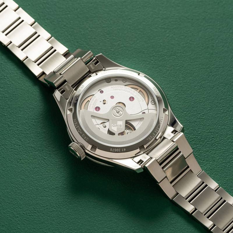 Au cœur de cette montre se trouve le calibre Oris 403, un mouvement automatique suisse de renom qui assure une performance de pointe. Ce mouvement est réputé pour sa robustesse et sa précision, opérant à une fréquence de 28,000 A/h (4 Hz). Sa spécificité réside dans sa réserve de marche exceptionnelle de 120 heures, soit cinq jours complets, un exploit qui élimine le besoin de fréquents remontages. La masse oscillante visible à travers le fond transparent contribue à la fois à l'attrait esthétique et à la fonction pratique du calibre.