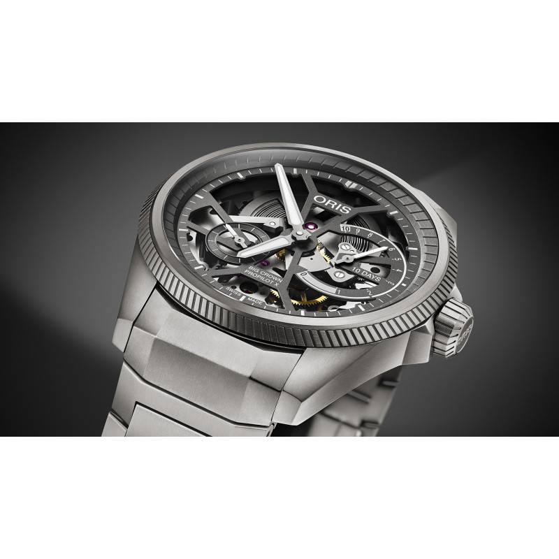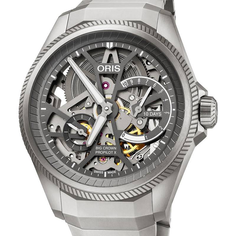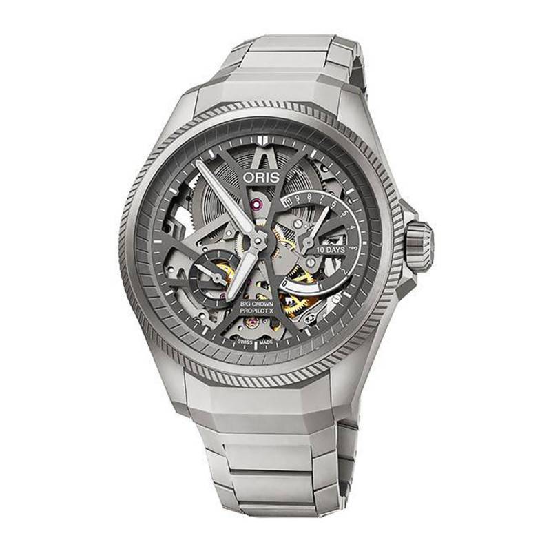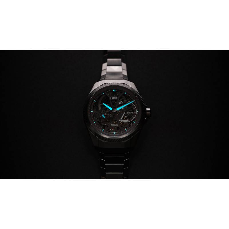Au sein de ce précieux garde-temps Oris, vous observerez avec joie un cadran squelletté de forme ronde. Vous aurez donc l'opportunité de pouvoir observer le mécanisme fonctionner sur ce cadran. Sur le pourtour, un chemin de fer des minutes de couleur blanche voit le jour. Pour parfaire votre lecture de l'heure des index bâtons seront placés tout autour de ce dernier. Ils seront revêtus d'un traitement Superluminova BG W9 qui les rendra luminescents et donc visibles même en cas de faible luminosité. Sur sa partie centrale, le cadran se trouve composé de deux aiguilles qui indiqueront les heures et les minutes. Comme pour les index vous découvrirez grâce à leur marquage la présence du même traitement luminescent pour toujours être en mesure de vous fournir l'heure. A trois heures vous trouverez un indicateur de réserve de marche non-linéaire allant jusqu'à dix jours qui montre la puissance restante avec une grande précision au fur et à mesure que le temps ne s'écoule. A 7 heures 30 c'est un compteur petites secondes qui sera implanté pour avoir une exactitude sur le temps passé. Après les éléments du cadran, l'horloger implantera diverses mentions sur celui-ci. Tout d'abord sur l'index de six heures se trouvera la référence Swiss Made par rapport au type de mécanisme choisi. Juste au-dessus sera inscrit le nom de la collection Big Crown ProPilot X et finalement sous l'index de midi Oris signera de lui-même son nom.
