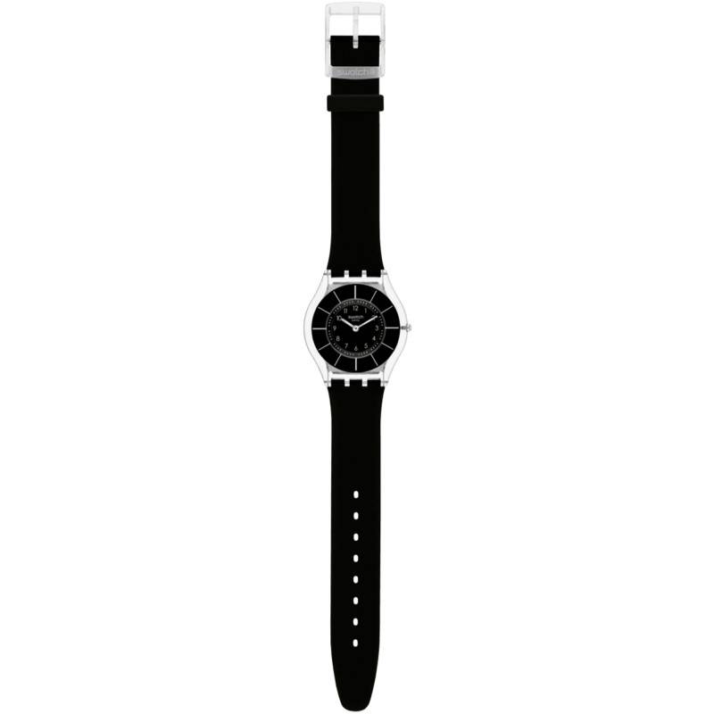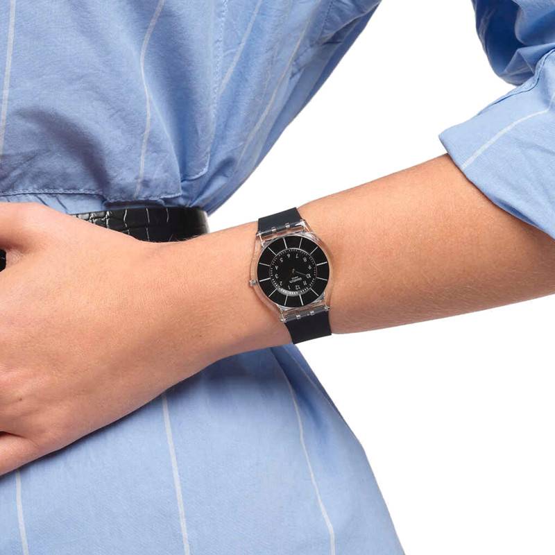 Pour ceux qui recherchent un modèle tendance, unique et intemporel, laissez nous vous présenter la montre BLACK CLASSINESS AGAIN SS08K103 créée et fabriquée par la maison suisse Swatch. Pour vous la décrire avec précision, sachez qu'elle est dotée d'un boîtier de 34 millimètres de diamètre et de 4,3 millimètres d'épaisseur. Très robuste, ce dernier a été fabriqué à partir de matériau biosourcé de très haute qualité. S'adaptant parfaitement aux poignets féminins, ce modèle est étanche jusqu'à 3 ATM grâce à son fond de boîte de type emboîté. par ailleurs, cette montre se voit équipée d'un verre minéral pour éviter les traces inesthétiques. Enfin, un bouton remontoir est disposé dans la continuité des trois heures pour vous faciliter le réglage des aiguilles.