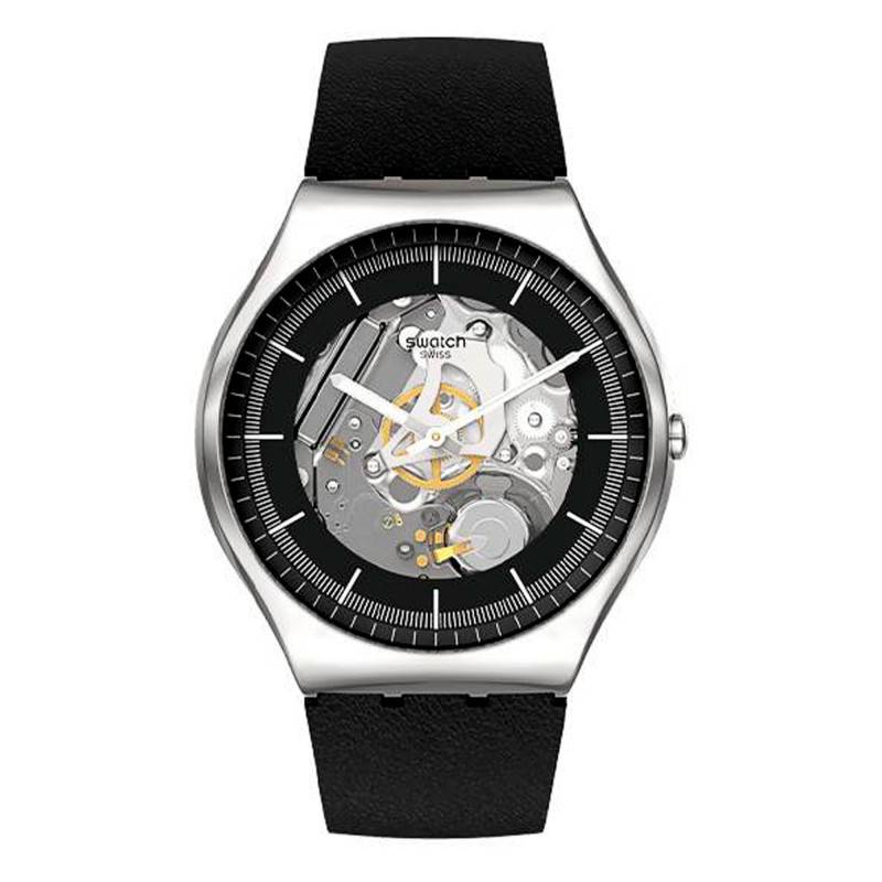 De forme ronde, le cadran au design squelette laisse la possibilité au propriétaire de la montre de pouvoir observer le mécanisme indéfiniment. Au centre, deux aiguilles, celles des heures et des minutes de forme glaive habillées d'une finition luminescente, afin de pouvoir lire l'heure également dans les endroits sombres. Par ailleurs, ce disque abrite un discret chemin de fer des minutes. Autour de ce dernier, un cercle noir est vêtu d'index de forme bâton et de couleur blanche qui représentent les heures. Pour finir, la signature de la marque Swatch figure à 12 heures.