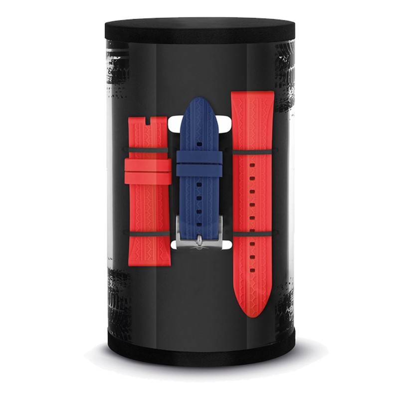 Cette montre est accompagnée de deux bracelets texturés. Le premier est de teinte rouge et le second est de couleur bleue. Ils sont conçus en caoutchouc et vous pourrez facilement les accorder à vos tenues. Ils se maintiendront fermement à votre poignet grâce à leur boucle ardillon en acier inoxydable. Leur largeur d'entre-corne est de 22 mm.