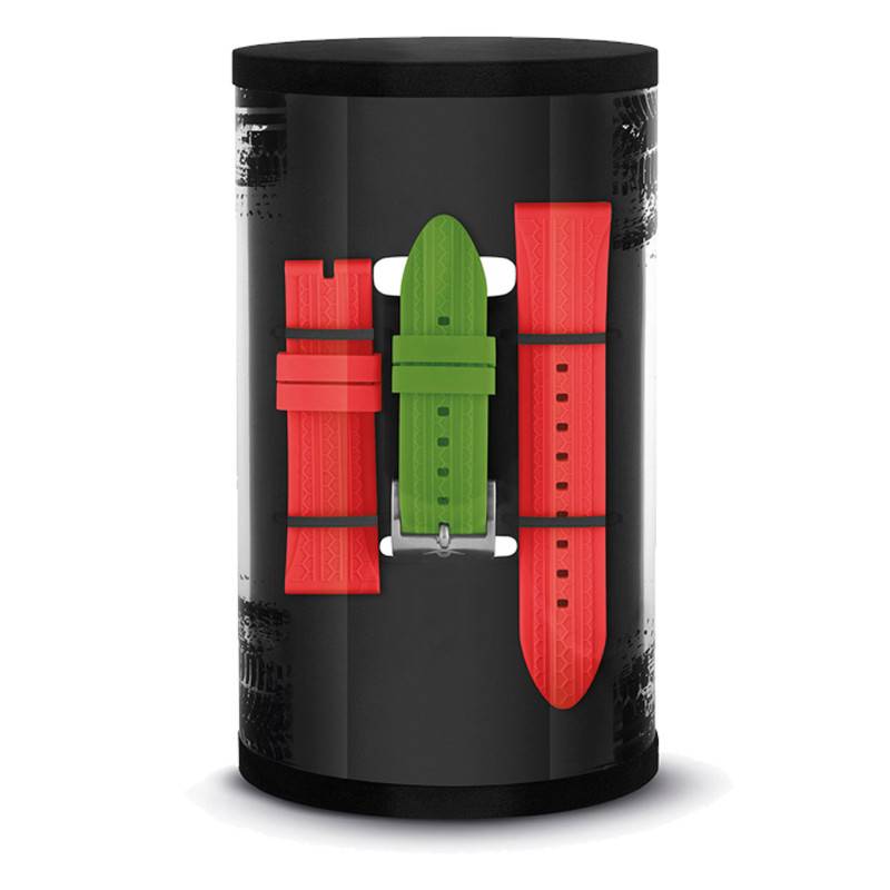 Cette montre est accompagnée de deux bracelets en caoutchouc texturé. L'un est de teinte rouge et l'autre est de couleur verte, ce qui vous permettra de les assortir à toutes vos tenues selon vos préférences. Ils ont une largeur d'entre-corne de 22 mm et se ferment à l'aide d'une boucle ardillon argenté, assurant ainsi un maintien sécurisé à votre poignet.