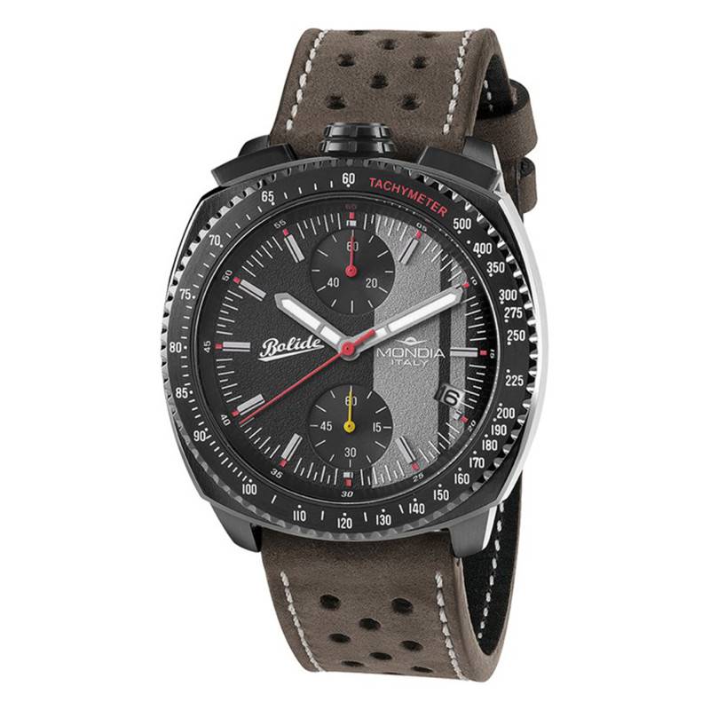 Mondia est une marque horlogère créée en 1935 par le technicien Paul Vermot. C'est une manufacture qui s'impose par son excellence et sa créativité. Ses montres performantes mettent à contribution une technicité pointue, des matières de haute qualité et un design épuré. Aujourd'hui, elle vous dévoile ce fabuleux modèle Bolide Sport MI-800-BK-03BK-CP à l'attention de tous les amoureux de vitesse. Son style urbain et ultra-sportif en font un garde-temps unique. Son boîtier arbore une forme coussin et est réalisé en acier inoxydable 316L de finition brossée. Il mesure 42 mm de largeur, 11 mm d'épaisseur et est parfait pour tous les hommes en quête d'originalité. À cela, s'ajoute une lunette crantée de couleur noire qui intègre une échelle tachymétrique. Elle permet de mesurer la vitesse de déplacement d'un objet ou d'une personne. Les fonctions sont réglées par les deux boutons-poussoirs et la couronne noirs placés à 1, 11 et 12 heures. Le cadran est recouvert d'un verre minéral plat et pour finir, le fond de boîte vissé affichant une gravure garantit une étanchéité de 5 ATM.