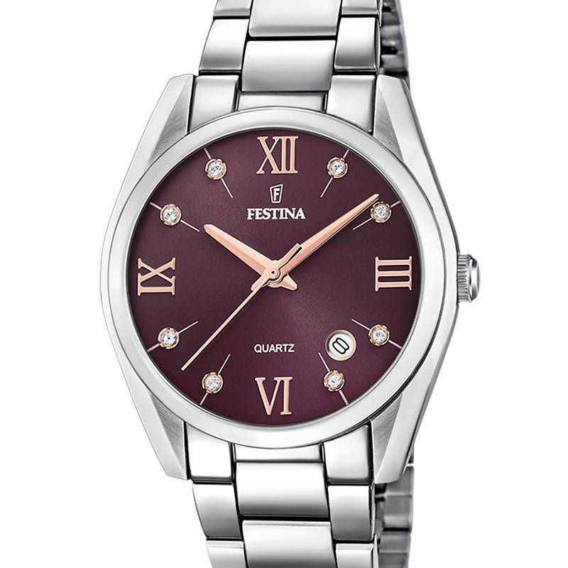 C'est un cadran de forme ronde et de couleur rouge bordeaux qui vient composer cette montre. Sa finition soleillée lui donnera de la luminosité et de l'éclat. Au centre, deux aiguilles et une fine trotteuse viennent parcourir les heures, les minutes et les secondes. Elles sont argentées, de même que les index chiffres romains à 3, 6, 9 et 12 heures. Tandis qu'à 1, 2, 4, 5, 7, 8, 10 et 11 heures les index sont représentés par des strass. De plus, vous trouverez un guichet date entre 4 et 5 heures. Pour finir, Festina signe cette création à midi en lettres argentées.