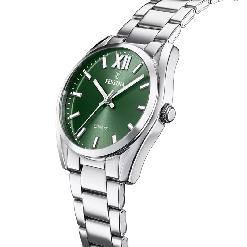 De forme ronde, le cadran de cette montre présente un magnifique vert sapin. Sa finition soleillée lui donne de l'éclat et le rend lumineux. Ce cadran vous fera l'effet d'une petite balade matinale dans une forêt de sapins. Il vous présente en son centre trois aiguilles argentées qui s'animeront afin de vous indiquer les heures, les minutes et les secondes avec la plus grande précision. Par ailleurs, les heures sont représentées par des index bâtons assortis aux aiguilles. Vous remarquerez que celui des 12 heures est représenté en chiffres romains. Aussi, un chemin de fer des minutes noir est présent sur le pourtour du cadran pour vous offrir une plus grande précision. Notez que les aiguilles ainsi que les index sont pourvus d'un traitement luminescent pour une lecture optimale de l'heure même dans les endroits peu éclairés. C'est sous midi que Festina a choisi de signer ce cadran de cette montre en blanc.