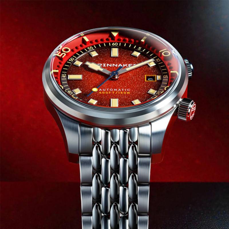 Le cadran de la Spinnaker Bradner Automatic est véritablement captivant avec sa teinte rouge flamboyante qui attire l'œil. Ce fond rouge est magnifié par des index luminescents, permettant une lecture de l'heure aisée même dans l'obscurité, grâce à une luminescence efficace. Les aiguilles sont également luminescentes, apportant une touche de sophistication qui se manifeste par un jeu subtil de lumière. La montre dispose d'un guichet de date placé stratégiquement pour offrir une visibilité optimale. Le cadran est entouré d'une lunette interne équipée d'un chemin de fer des minutes, contribuant à un aspect technique et fonctionnel. Ceci, combiné avec le verre saphir traité antireflets, assure une protection exceptionnelle tout en mettant en valeur les détails du cadran.