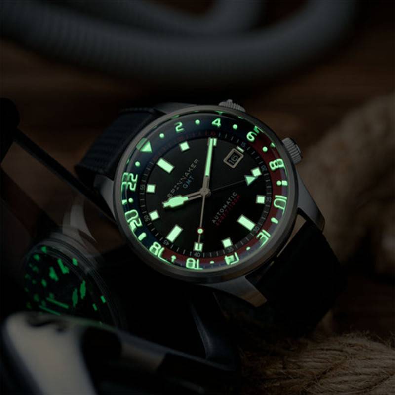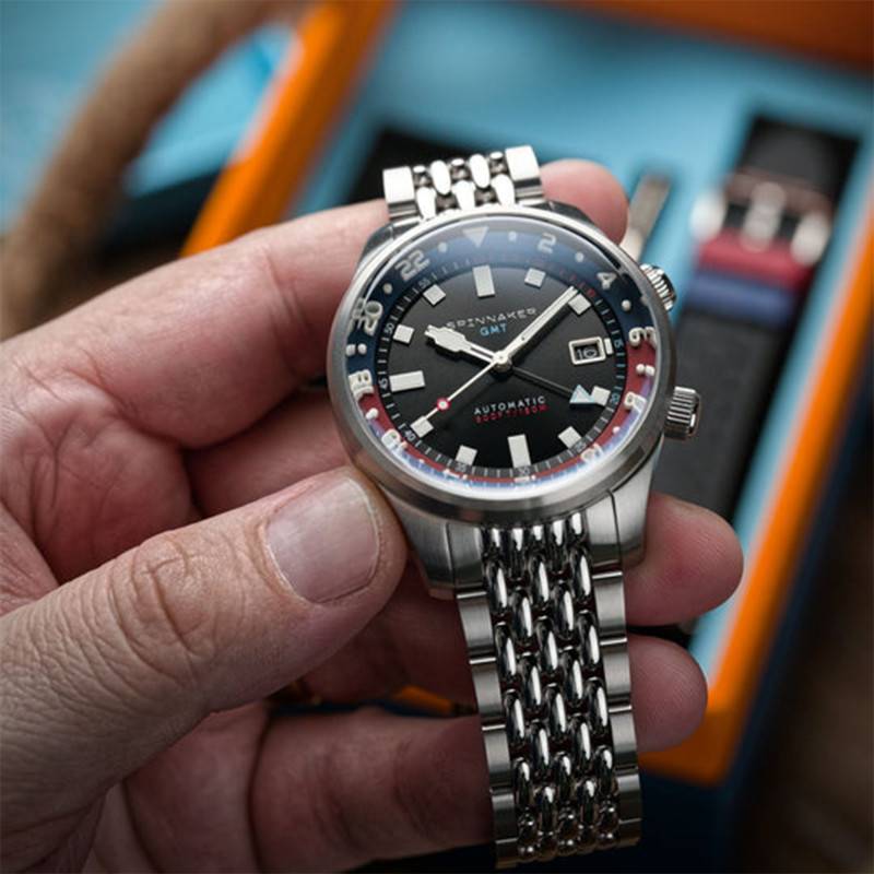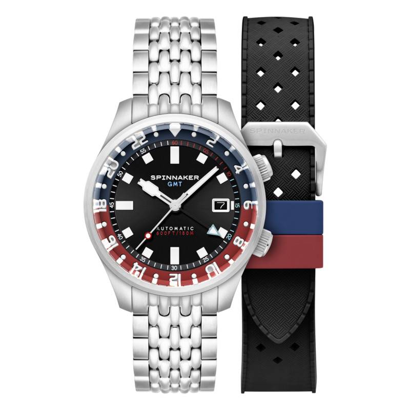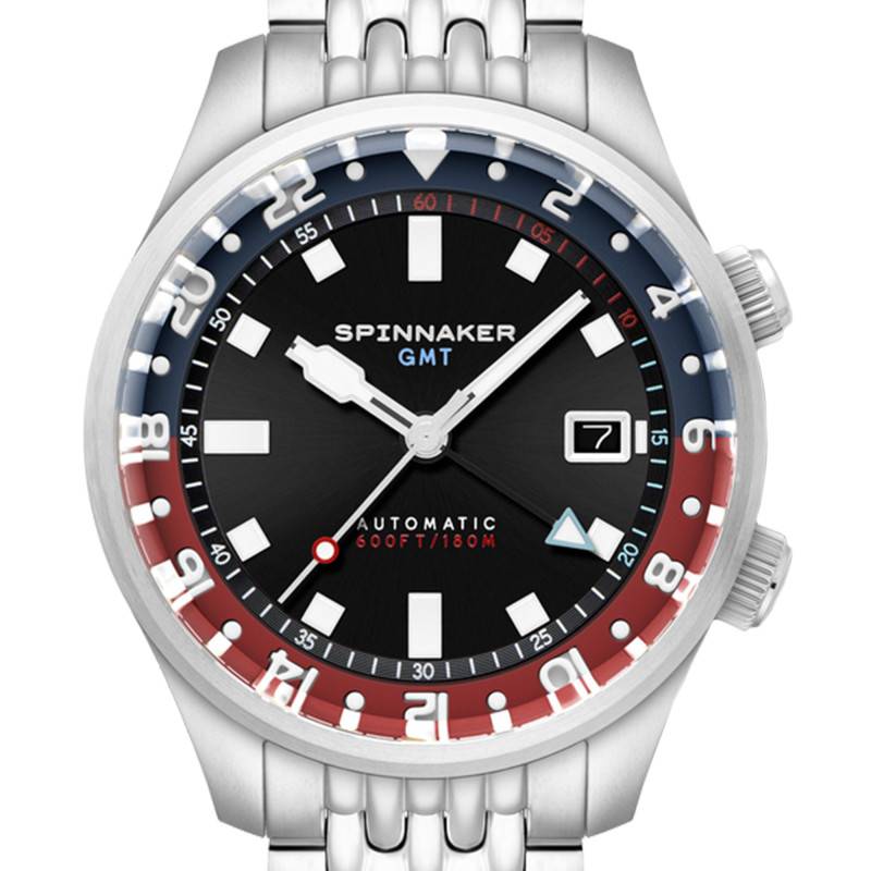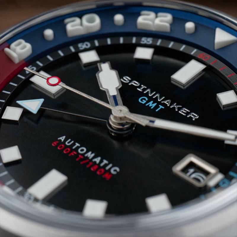 De forme ronde, le cadran soleillé de cette montre se pare d'une couleur noire qui accentue son côté élégant. Sur son pourtour, est gradué un chemin de fer des minutes qui facilite la lecture temporelle. Notez que ce cadran est muni d'une lunette interne rotative qui comporte la graduation de la fonction GMT. Elle est pointée par l'aiguille noire dotée d'une flèche bleue. Les trois aiguilles placées au centre du cadran se chargent de communiquer les heures, les minutes et les secondes. Celles-ci, l'aiguille GMT et les index qu'elles parcourent sont revêtues d'un traitement luminescent blanc qui vous permettra d'avoir une bonne visibilité même dans les milieux obscurs. Pour compléter la lecture horaire, un guichet date prend place à 3 heures. Pour finir, Spinnaker signe son modèle à 12 heures en apposant son nom.
