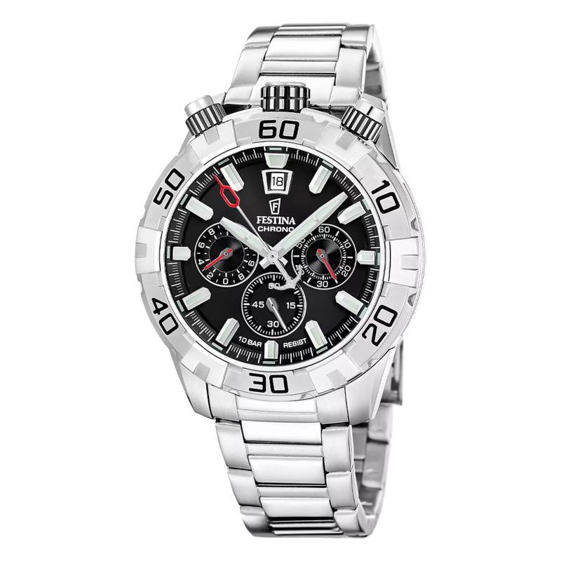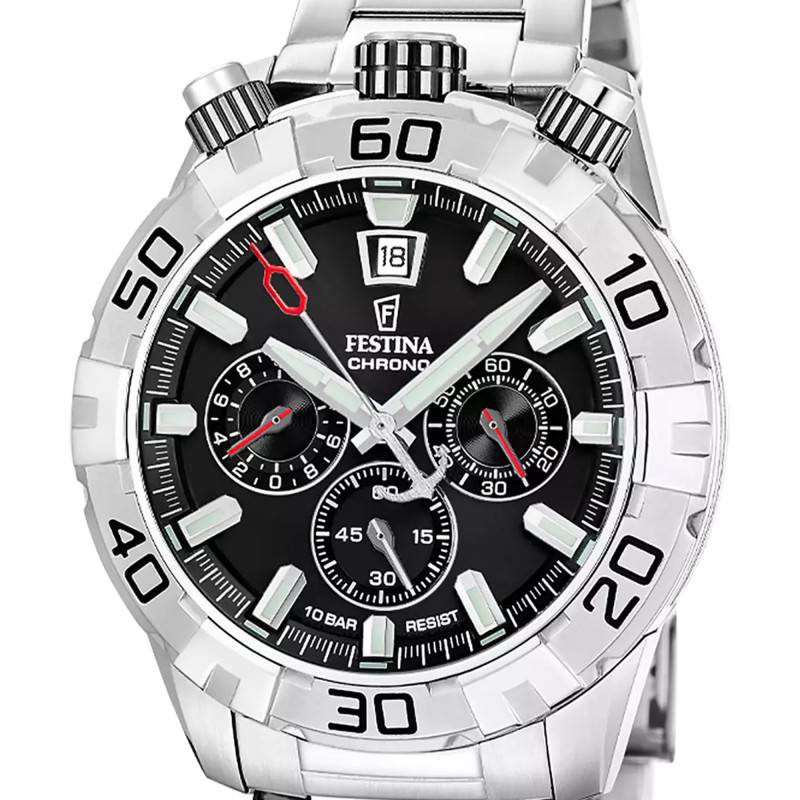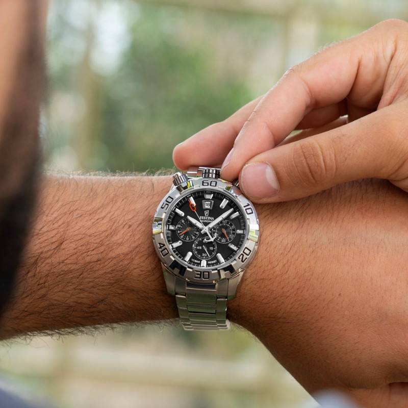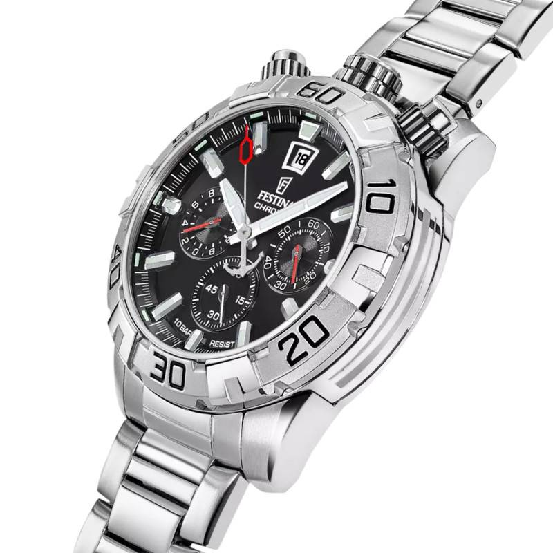 Le cadran de cette montre Festina se présente dans un noir profond avec une finition mate, rehaussé par des aiguilles et index luminescents pour assurer une visibilité parfaite dans des conditions de faible luminosité. Les chiffres arabes sont présents pour une lisibilité simplifiée, renforcée par un chemin de fer des minutes qui parcourt le pourtour du cadran. Trois compteurs additionnels embellissent ce cadran, permettant de mesurer des intervalles de temps détaillés jusqu'à 10 heures, 60 minutes et 60 secondes, ce qui souligne la nature technique et sportive de la montre.