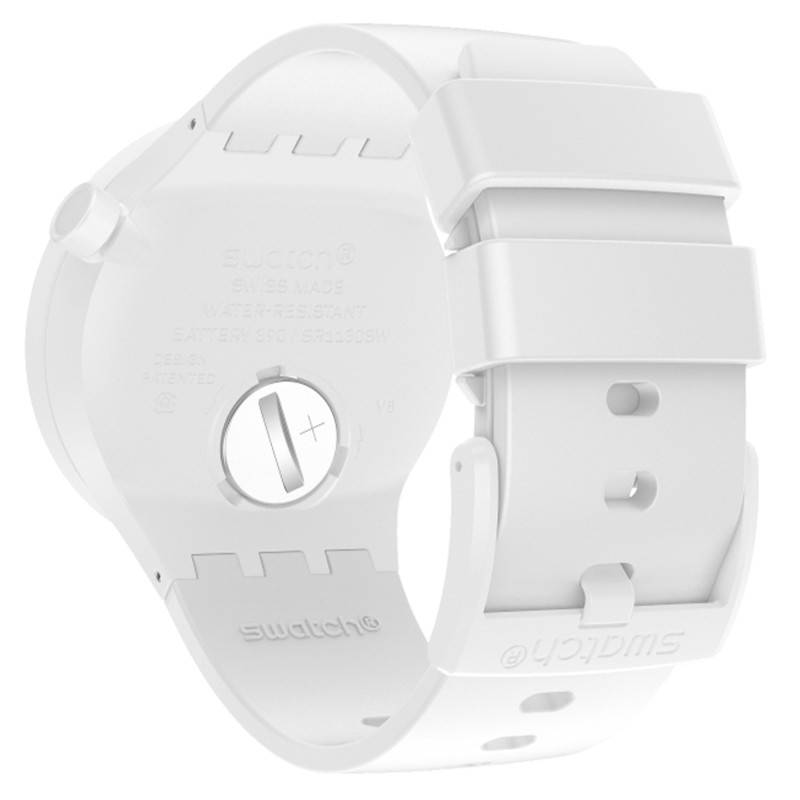 Intemporelle et innovante caractérisent la maison horlogère Swatch depuis de nombreuses décennies. Elle vous partage aujourd'hui une montre épurée et moderne appartenant à la collection Big Bold. Il s'agit du modèle C-White équipé d'un boîtier en plastique de forme ronde. Ce modèle se destine aux hommes et séduira chaque femme en quête d'un garde-temps chic, aux multiples facettes. Vous retrouverez un diamètre de 47 mm pour une épaisseur de 10 mm. De plus, une lunette fixe viendra entourer le cadran lui-même protégé par un verre plexiglas des chocs et rayures éventuels du quotidien. Par ailleurs, vous retrouverez une couronne remontoir logée à 2 heures qui vous permettra de modifier à votre convenance les différents marqueurs temporels présents sur le cadran. Enfin, ce modèle arbore un fond de boîte monobloc et vous garantira une étanchéité de 3 ATM.
