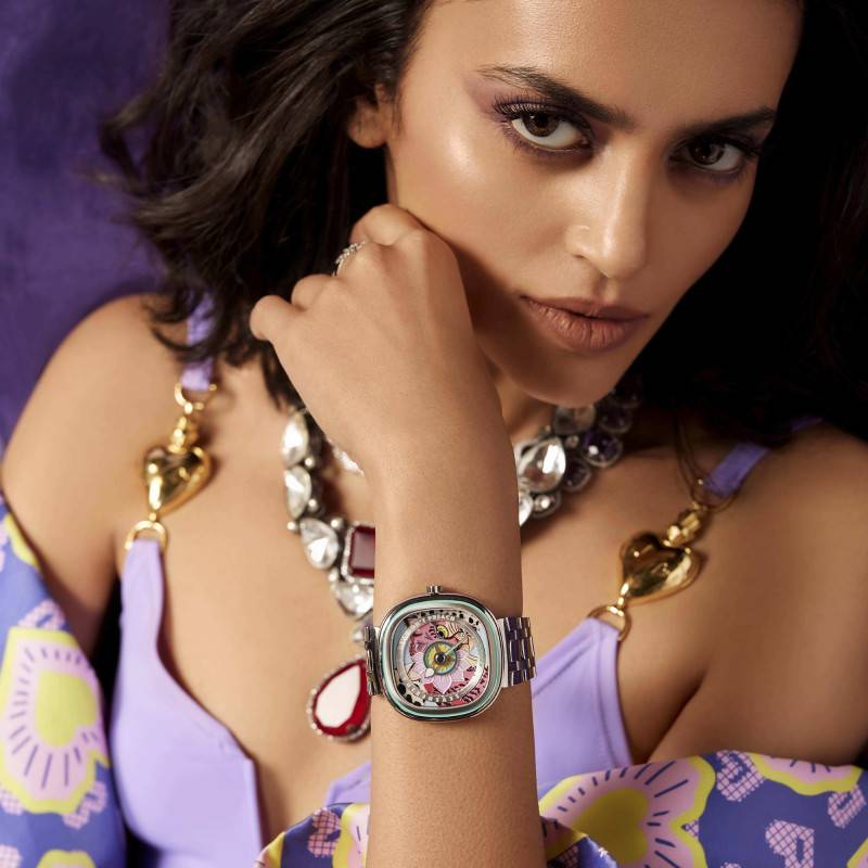 SevenFriday est une marque de style de vie fondée en 2012 à Zurich par Daniel Niederer. Jouissant d'une renommée mondiale, elle propose à tous les amoureux de l'horlogerie des montres originales, authentiques et intemporelles qui rompent avec les codes traditionnels pour véhiculer une vision plus contemporaine, vibrante et futuriste de la mode. En repoussant les limites et en repensant les normes esthétiques, elle permet à toute personne en quête de nouveauté de se démarquer en exprimant avec liberté et extravagance sa propre identité. Elle présente aujourd'hui deux nouvelles montres d'inspiration indienne lancées en collaboration avec Papa Don't Preach. Laissez-vous tenter par cet agréable garde-temps C1/01 SevenFriday x Papa Don't Preach et adoptez-le au quotidien pour ressortir avec prestance et originalité votre charme féminin en se démarquant au quotidien. Fusionnant la haute précision suisse et le style indien, ce dernier créera un effet vibrant attrayant sur votre poignet et viendra parer toutes vos tenues avec une touche de subtilité intemporelle. À porter et à admirer en toute occasion, il dispose d'un boîtier coussin TV dont la forme a été retravaillée pour le rendre encore plus compacte et plus fine, le destinant ainsi à habiller délicatement les poignets des femmes. Agréable à porter et confortable, ce dernier est fabriqué en acier inoxydable avec des finitions brossées et polies qui lui octroient un charme plus intemporel. Aux dimensions résolument soignées, il fait 42 mm de longeur pour une largeur de 42,50 mm et une épaisseur de 8,50 mm. Il est sublimé par des lignes rainurées qui lui accordent un aspect plus dynamique. La rainure sur la lunette est laquée en vert berlac comme la couronne disposée à 3h. Servant au réglage des aiguilles, celle-ci prend une délicate forme de cœur qui fait un clin d'œil à la signature de design PDP. À l'opposé, vous trouverez une signature spéciale « 7F loves PDP » apposée à 9h, soulignant la collaboration et la relation entre Papa Don't Preach et SevenFriday. Par ailleurs, le cadran est protégé contre les chocs issus de l'usage quotidien par un verre minéral K1 durci traité antireflet qui permet une agréable visibilité de l'heure sous tous les angles. Au verso, le fond de boîte est maintenu par quatre vis, ce qui assure une étanchéité de 3 ATM. Une puce NFC en polycarbonate est intégrée dans ce dernier, vous permettant de coupler votre montre et votre téléphone.