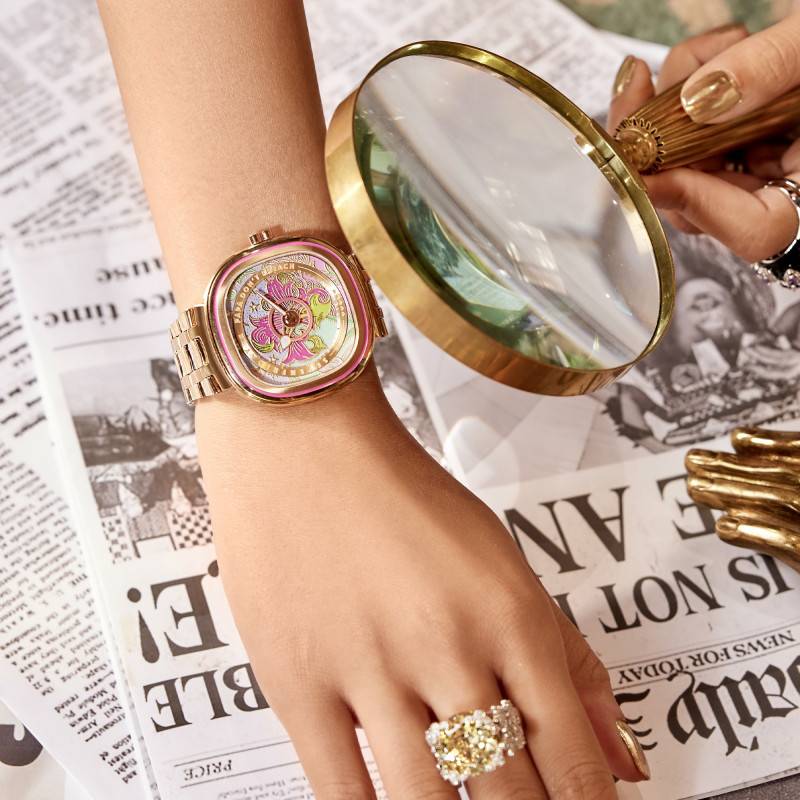 La marque incontournable SevenFriday ne cesse de cultiver une identité tendance, contemporaine et distinguée à travers des créations résolument urbaines et intemporelles qui lui ont valu une place remarquable sur le marché de la mode internationale. Elle présente depuis sa création en 2012 une sélection éblouissante de montres élégantes, raffinées et originales qui se démarquent par leurs formes géométriques épurées et leur style toujours prononcé. Avec la collaboration de Papa Don't Preach, la marque dévoile aujourd'hui deux modèles époustouflants qui ne vous laisseront pas indifférent ! Nous vous présentons ici la montre C2/01 Papa Don't Preach x SevenFriday pensée pour les femmes sophistiquées et stylées comme vous. Faisant partie de la série C, il s'agit d'une fusion élégante de la précision suisse et de l'art indien qui a donné vie à une montre raffinée, élégante et singulière qui fera assurément sensation sur votre poignet. Elle se présente avec un boîtier de forme coussin TV revisité pour être plus fine, plus ronde et plus compacte, convenant à la perfection à la gent féminine. Ce dernier se posera avec douceur sur votre poignet en vous assurant un port agréable et un confort ultime tout au long de la journée. Il est fabriqué en acier inoxydable avec une finition en PVD qui lui accorde cette belle couleur dorée facile à assortir. Il arbore un aspect brossé avec des détails polis qui mettent en valeur la finesse de sa conception. Pour ce qui est des dimensions, il mesure 42 mm de longueur et 42,50 mm de largeur pour une épaisseur de 8,50 mm. Des lignes rainurées le décorent, dont la rainure sur la lunette est laquée d'une couleur rose berlac, accordant à l'ensemble un air plus saisissant. Par ailleurs, un verre minéral K1 durci passe par-dessus le cadran afin de le préserver des éventuels chocs tout en permettant une bonne lisibilité de l'heure grâce à son traitement antireflet. La carrure est marquée à 9h par une signature spéciale « 7F loves PDP » évoquant la relation entre Papa Don't Preach et SevenFriday. Elle loge à 3h une délicate couronne laquée rose berlac qui se distingue par sa forme de cœur, signature du design PDP. Celle-ci vous permettra de régler à tout moment les heures et les minutes. Cette jolie œuvre est un indispensable de toute femme soucieuse de son style qui souhaite concilier mode, horlogerie et art. Elle est étanche à 30 mètres grâce à son fond de boîte maintenu par quatre vis. Portant la signature Papa Don't Preach x SevenFriday, celui-ci intègre une puce NFC en polycarbonate qui vous permettra de coupler la montre au téléphone.