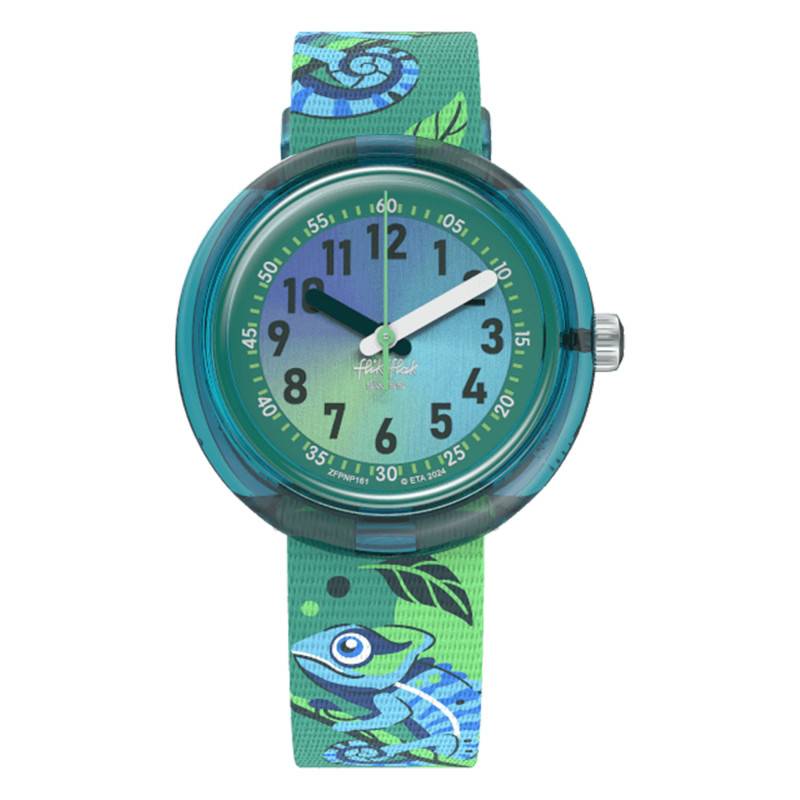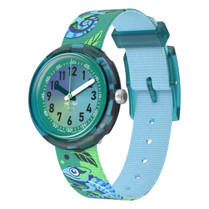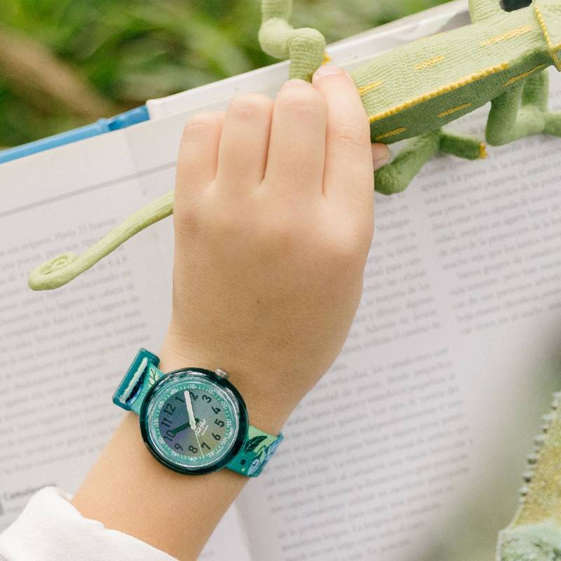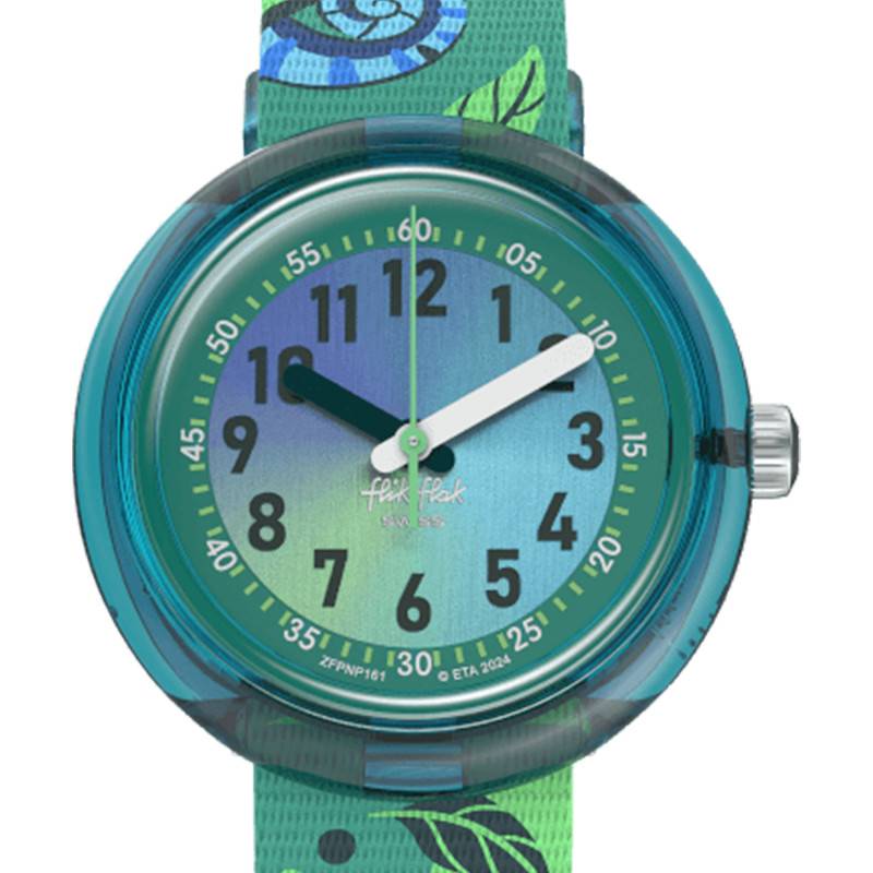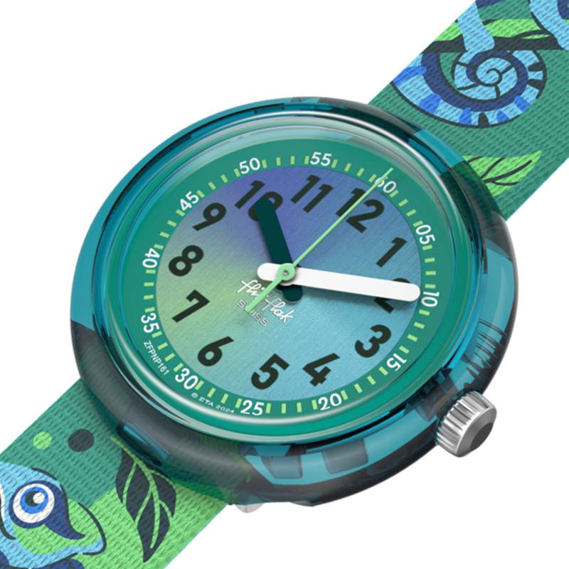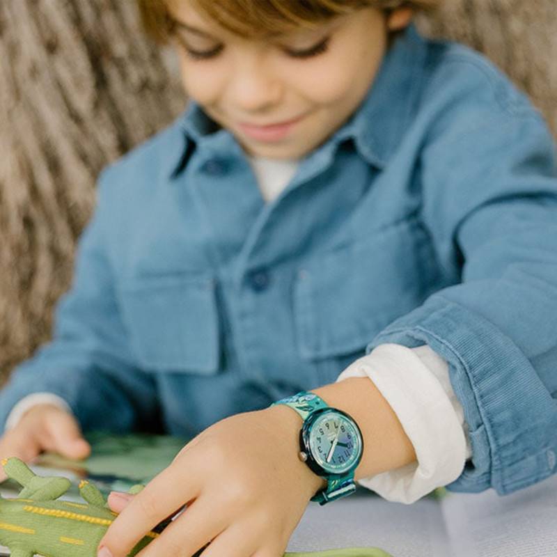 La montre Flik Flak se distingue par son design à la fois ludique et pratique, conçu spécifiquement pour les enfants. Le boîtier en matériau biosourcé, également composé de plastique, mesure 31,85 mm de diamètre, ce qui est idéal pour un poignet d'enfant. Avec une épaisseur de 9,25 mm, elle reste légère et confortable à porter tout au long de la journée. La forme ronde classique se marie avec une magnifique finition colorée, ajoutant à l'attrait visuel de la montre. Le bouton remontoir, utile et facile d'accès, permet un réglage aisé de l'heure.