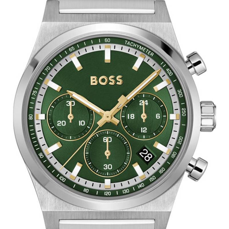 La montre homme Boss Candor Chrono est une illustration parfaite de l'harmonie entre le style contemporain et la fonctionnalité. Arborant un boîtier rond de 41,00 mm de diamètre avec une épaisseur de 10,35 mm, cette montre affiche des dimensions qui s'accordent parfaitement à tout poignet masculin. Sa conception utilise un acier de haute qualité, à la fois brossé et poli, ce qui lui confère une allure robuste. Avec un poids de 160 g, elle est conçue pour être à la fois imposante et confortable. Sa couronne et ses boutons sont disposés de manière traditionnelle, permettant un accès facile pour ajuster l'heure ou activer les fonctions chronométriques. La couronne est centrale, flanquée de deux boutons poussoirs, qui soulignent son caractère technique et ses fonctionnalités multiples. Le style de la montre est à la fois élégant et moderne, capable de s'adapter à une tenue décontractée comme à un costume raffiné. La solidité et la transparence de son verre minéral plat protègent efficacement le cadran, tout en contribuant à l'esthétique fluide de la montre.