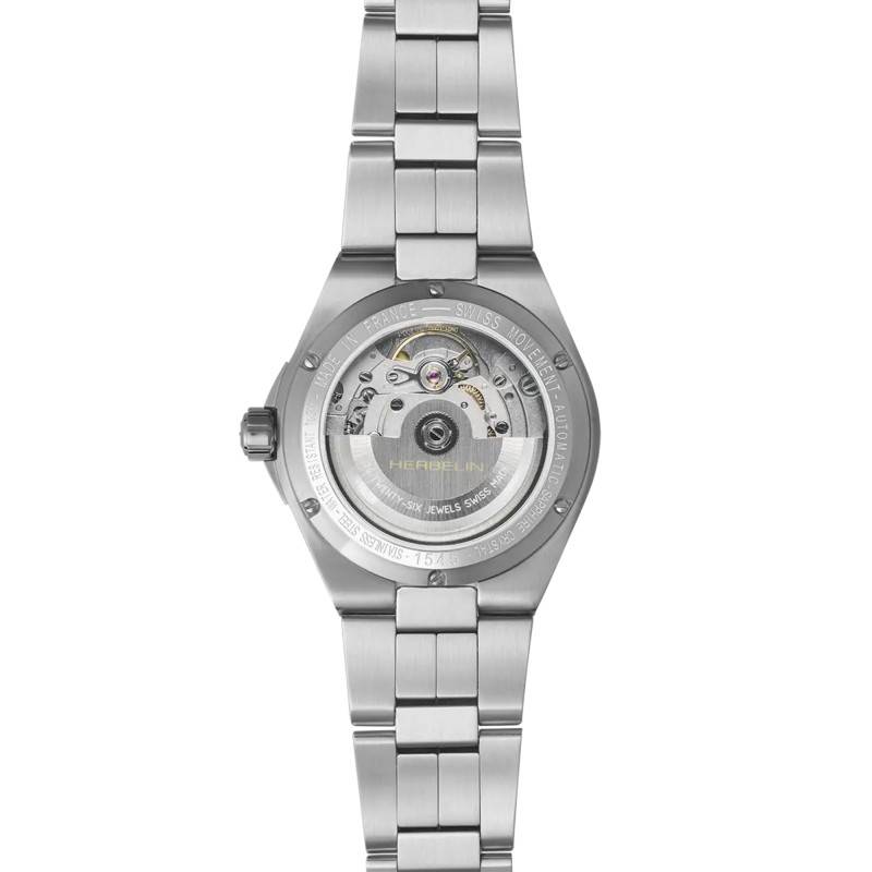 La particularité de ce cadran soleillé réside dans ses stries qui viennent s'illuminer de part et d'autre, selon la lumière à laquelle elles sont exposées! Pour renforcer l'univers de cette Cap Camarat, Michel Herbelin a pris soins d'apposer une finition luminescente sur les aiguilles des heures et des minutes ainsi que sur les index bâtons rectangulaires de couleur argentée. À 6h, vous retrouverez l'inscription "Made In France" ainsi qu'un guichet date et à 12h, le nom de la marque en lettres capitales.