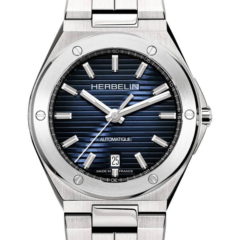 C'est un bleu profond et strié qui habille le fond de ce cadran, sublimé par une légère finition soleillée qui donne un effet de relief, comme si le cadran allait sortir du sublime verre saphir le protégeant. Les aiguilles des heures et des minutes ainsi que les index rectangulaires sont luminescents afin de pouvoir lire l'heure même dans les profondeurs marines. A cela s'ajoute un chemin de fer très discret de couleur grise qui vient rappelé l'argenté du boitier et de l'ensemble des index. Nous retrouvons également le nom de la marque placé à douze heures ainsi que la mention "automatique". Enfin, le guichet date encadré de blanc est situé à 12h.
