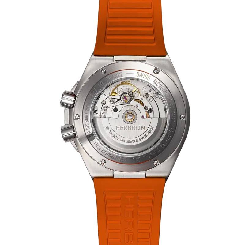 Herbelin est une marque horlogère française partageant son savoir-faire au monde entier. Son histoire débute en 1947, dans le berceau de l'horlogerie française, à Charquemont, un village situé au cœur des montagnes du Jura. Soucieuse de redonner ses lettres de noblesse à l'horlogerie française traditionnelle, la maison se lance dans la fabrication de garde-temps robustes et élégants qui sont destinés à vous accompagner au quotidien. Pour cela, chacun de ses modèles est imaginé, développé et testé afin de vous garantir une précision indéniable et durable. Elle vous présente aujourd'hui la montre Cap Camarat Diver Automatic 1745A14CMD qui est destinée aux poignets des hommes. Elle se pare d'un boîtier de forme tonneau qui est réalisé en acier inoxydable 316L brossé et poli et d'une lunette ornée de têtes de vis. Argenté, ce dernier affiche 42 mm de diamètre et dispose d'une épaisseur de 12,30 mm. Il est muni d'un verre saphir qui protège le cadran des chocs potentiels et comporte deux couronnes grises, légèrement crantées et fixées sur la droite. Protégées, celles-ci assurent une bonne prise en main et ont pour rôle de manipuler les différents éléments centraux. Le tout se ferme par un fond de boîte transparent garantissant une étanchéité de 20 ATM et à travers lequel vous pouvez admirer les rouages du mouvement.