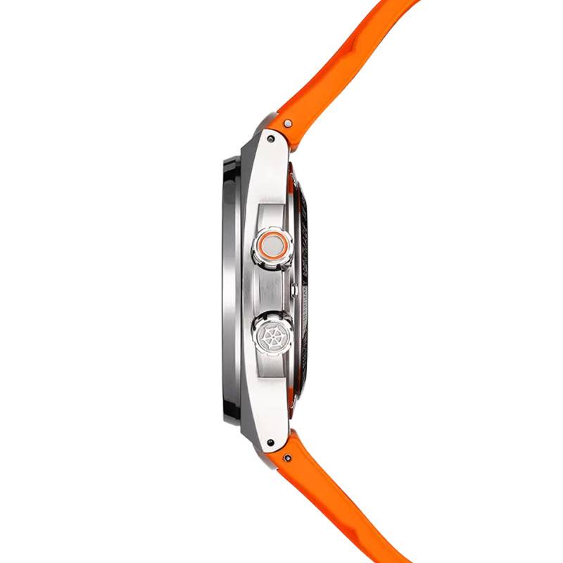 Ce bracelet à l'allure captivante vous accompagnera en toute condition. Il est réalisé en silicone, ce qui lui confère une forte résistance et une souplesse indéniable. Léger et confortable, il épousera les lignes de votre poignet et grâce à son joli ton orange, il ne passe pas inaperçu. Il est relevé par des lignes incrustées et il dispose d'une boucle ardillon facilitant sa manipulation.