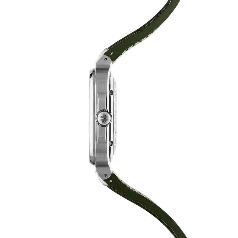 Le bracelet de cette montre est à la fois moderne et fonctionnel. Conçu en caoutchouc FKM de couleur verte, il offre un confort exceptionnel et une grande durabilité. Ce matériau est idéal pour ceux qui nécessitent une montre à la fois élégante et résistante aux conditions difficiles. L'entrecorne de 25 mm offre une stabilité supplémentaire en assurant que la montre repose parfaitement sur le poignet. Le fermoir boucle ardillon en acier ajoute une touche classique à l'ensemble et garantit un ajustement sûr.