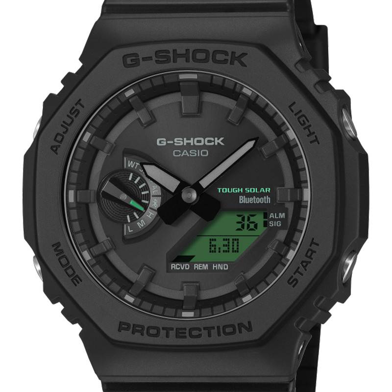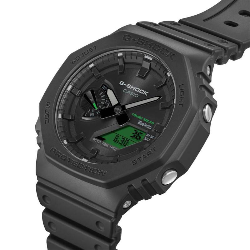 Ce garde-temps signé Casio G-Shock, modèle Capsule Black & Electro Green, incarne l'excellence de l'horlogerie japonaise. Conçu pour les aventuriers modernes, son boîtier rond reflète une esthétique robuste, accentuée par ses dimensions généreuses de 48,50 mm de longueur, 45,50 mm de largeur et une épaisseur de 11,90 mm. La fibre de carbone et la résine, matériaux de choix pour cette montre, garantissent une combinaison exceptionnelle de légèreté et de résistance. Avec un poids de seulement 52 g, elle offre un confort optimal sans compromettre sa durabilité. La lunette fixe en résine et le fond de boîte maintenu par des vis témoignent de l'attention portée aux détails et à la fonctionnalité. La montre arbore une efficacité énergique grâce à son mouvement solaire et affiche fièrement son empreinte écologique en réduisant la nécessité de remplacer les piles classiques.