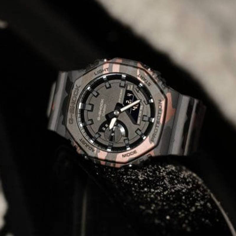 La Montre Capsule Camouflage de Casio G-Shock est une fusion parfaite entre technologie et design robuste. Sa forme ronde et son diamètre de 45.40 mm lui confèrent une présence marquante au poignet. Cette montre se distingue par sa qualité de fabrication exceptionnelle, garantie par une garantie internationale de 2 ans. Le boîtier en résine synthétique offre une résistance incroyable tout en gardant un poids léger de seulement 51 grammes. Équipée d'un fond maintenu par des vis, elle assure une étanchéité à 20 ATM, idéale pour la plongée ou les sports nautiques. Par ailleurs, le verre minéral plat protège efficacement l'ensemble, évitant les rayures lors des utilisations quotidiennes les plus exigeantes.