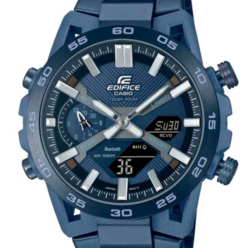 Casio est une marque japonaise de renom internationale qui occupe une place remarquable sur le marché de l'horlogerie par ses créations aussi pratiques qu'élégantes. Elle propose à tous les amoureux de montres un choix diversifié et impressionnant de garde-temps allant des plus minimalistes aux plus audacieux. De sa collection Edifice, elle vous présente aujourd'hui cette ravissante montre Capsule “Cool Blue” ECB-2000CB-2AEF, un modèle dynamique, multifonctionnel et hautement performant qui vous accompagnera avec détermination dans toutes vos aventures. Au total look bleu, cette dernière affiche un design racé inspiré des voitures de sport automobile et intègre des complications intéressantes et pratiques pour la vie quotidienne. Vous pourrez l'assortir avec toutes vos tenues en le conservant pendant de longues années grâce à sa conception innovante et robuste. Son boîtier dévoile des dimensions imposantes, convenant parfaitement aux poignets de la gent masculine. Il fait 47,80 mm de diamètre et 51 mm de longueur pour une épaisseur de 10,80 mm. Pesant 125 gr, il se posera délicatement sur votre poignet en vous assurant un port agréable et confortable en tout temps. Casio a porté son choix sur un bleu indigo naturel comme couleur pour le boîtier en le fabriquant en résine renforcée de fibres de carbone. Cette teinte nouvellement développée pour ce matériau apporte un aspect profond et intemporel à la montre, faisant toute sa singularité. La texture de la carrure évoque le flux du vent s'engouffrant dans une voiture de course de formule 1 qui dévale la piste, créant un effet captivant sur votre poignet. Ses composants métalliques sont réalisés en acier inoxydable avec un placage ionique bleu pour un rendu plus harmonieux. La lunette de ce modèle est graduée par une échelle 60 minutes présentée par des chiffres arabes et des traits tandis que le verre qui couvre son cadran est de type minéral. Par ailleurs, quatre boutons poussoirs sont installés sur les deux côtés de la carrure, vous aidant à naviguer entre les différentes fonctions et à régler l'heure. Pour finir, le fond de boîte se voit maintenu par des vis, assurant une étanchéité de 10 ATM.