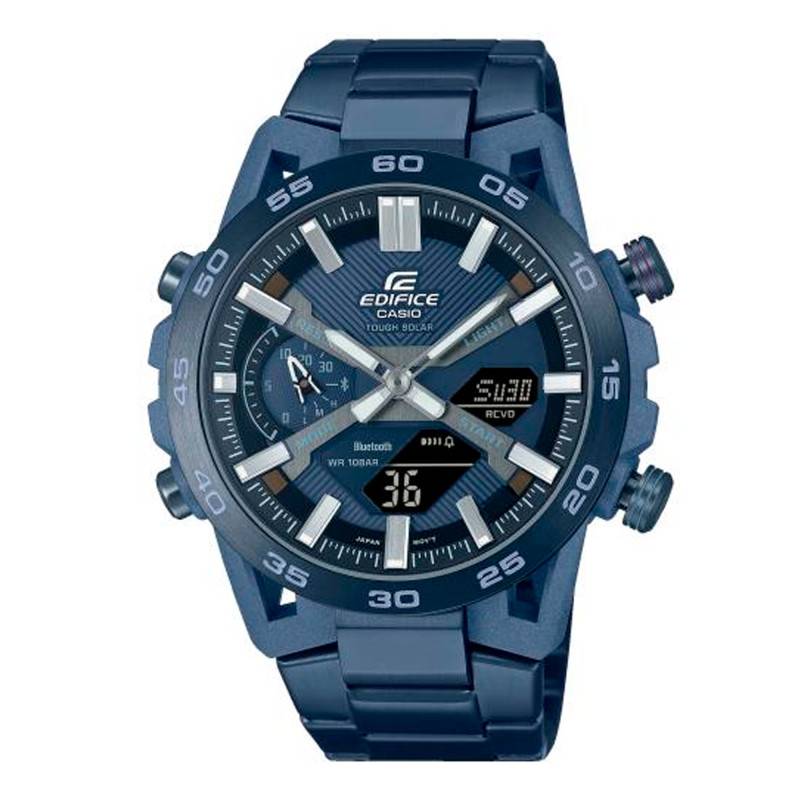 Avec sa structure multicouches et ses détails épurés, ce charmant cadran rond crée un look sportif exquis et permet une lecture temporelle agréable en toute occasion. Il présente un fond bleu et est rehaussé par des lignes droites qui lui accordent un aspect dynamique et mettent en valeur sa singularité. Il présente en premier lieu un affichage analogique assuré par deux aiguilles grises, disposées au centre, qui vous indiqueront les heures et les minutes avec une grande précision. De forme bâton pointu, celles-ci sont revêtues d'une couche Neobrite de couleur blanche, ce qui renforce la lisibilité de l'heure dans les conditions nocturnes. Elles pointent un chemin de fer des minutes échelonné en blanc par des traits et séparé de 5 en 5 par des index bâtons. Ces derniers vous aideront à repérer rapidement les heures. Ils sont rehaussés par des petits rectangles dotés également d'un revêtement Neobrite pour une meilleure visibilité du temps. Par ailleurs, un écran LCD est disposé entre 3h et 6h, vous offrant un affichage numérique de l'ensemble des fonctionnalités proposées. Par ailleurs, le sous-cadran placé entre 8h et 10h vous indiquera le mode actuel de la montre, le niveau de charge de la batterie et le temps restant du compte à rebours/l'alarme 30 minutes avant sa fin/son déclenchement. Deux plaques argentées sont installées sur le cadran portant des inscriptions informant sur la fonction des boutons poussoirs. Enfin, Casio signe sa montre en apposant son nom sous midi avec le nom et le logo de la collection Edifice ainsi que la mention “Tough Solar”.