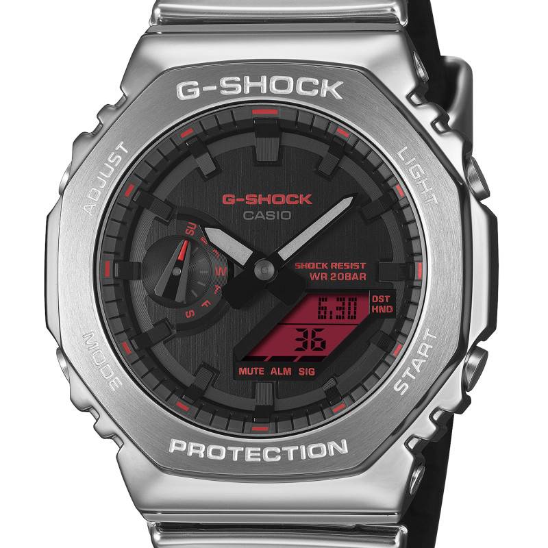 Le cadran de la Montre Capsule Fine Metallic de Casio G-Shock se distingue par des nuances de gris, noir et rouge. Cette combinaison de couleurs dynamiques donne un aspect moderne et distinctif. L'affichage double, à la fois analogique avec des aiguilles luminescentes et numérique, permet une lecture facile et rapide de l'heure. Grâce au revêtement Neobrite, une légère brillance illumine les aiguilles, augmentant la visibilité dans des conditions de faible luminosité. En plus des heures, minutes, et secondes, le cadran offre un calendrier complet avec l'affichage de la date, jour, mois et une fonction chronographe. Le cadre extérieur, encadré par des index et chemin de fer, encadre un espace central numérique, et le bouton Super Illuminator assure une visibilité optimale partout et à tout moment.