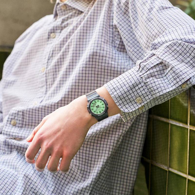 Sous son verre minéral robuste, le cadran de la Capsule Summer Reflection exhibe une teinte verte distincte, travaillée avec une finition de sablage pour absorber et diffuser la lumière harmonieusement. Ce cadran offre une lecture claire grâce à la combinaison d'un affichage analogique et numérique, mettant en avant les aiguilles profil luminescents pour une vision optimale même dans les conditions de faible éclairage. Porteuse de marqueurs d'index et d'un chemin de fer finement détaillé, la montre assure une lecture précise de l'heure. En supplément, elle intègre un affichage LCD apportant des informations numériques complémentaires, incluant un deuxième fuseau horaire, pour une gestion du temps globale et efficace. Neobrite et Super Illuminator renforcent encore l'aspect fonctionnel et innovateur de cette montre résolument tournée vers les besoins actuels de sa clientèle cosmopolite.