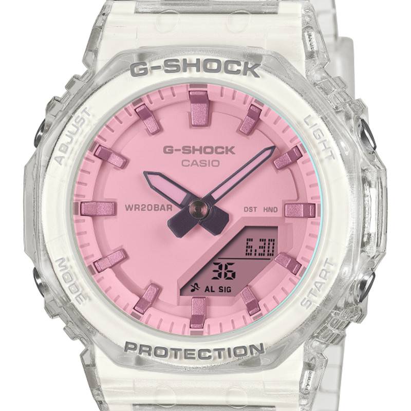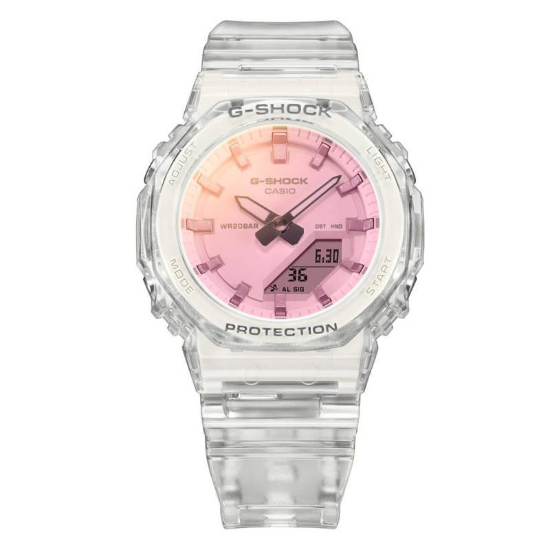 La montre Casio G-Shock Capsule Summer Reflection, avec sa référence GMA-P2100SR-7AER, allie parfaitement robustesse et élégance moderne, grâce à son design en résine grise. Le boîtier octogonal, offrant une dimension de 46 mm par 40,2 mm, présente un style structuré et distinctif qui s'inscrit parfaitement dans les tendances actuelles. La montre est également légère, pesant uniquement 40 grammes, ce qui assure un port confortable au quotidien, quelle que soit l'activité pratiquée. Sa conception utilise un verre minéral qui protège efficacement le cadran grâce à sa résistance aux rayures. De plus, avec une étanchéité de 20 ATM, cette montre est adaptée non seulement aux projections d'eau accidentelles, mais aussi à une plongée en toute sécurité jusqu'à 200 mètres. Le fond de boîte est sécurisé par des vis, ce qui renforce davantage son étanchéité et sa capacité à résister aux conditions environnementales difficiles. Les quatre boutons-poussoirs positionnés autour du boîtier permettent une manipulation simple et efficace de ses diverses fonctions avancées.