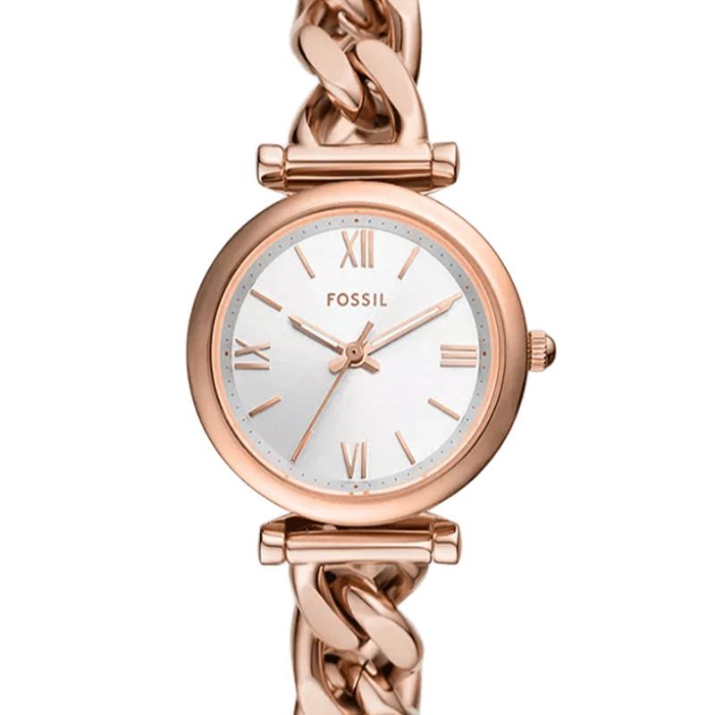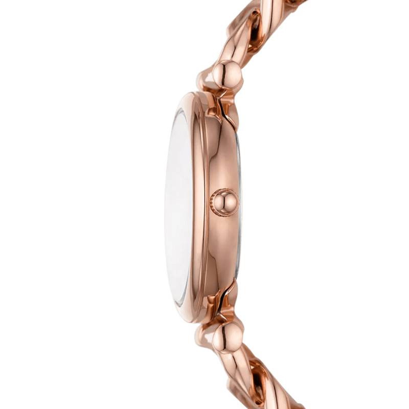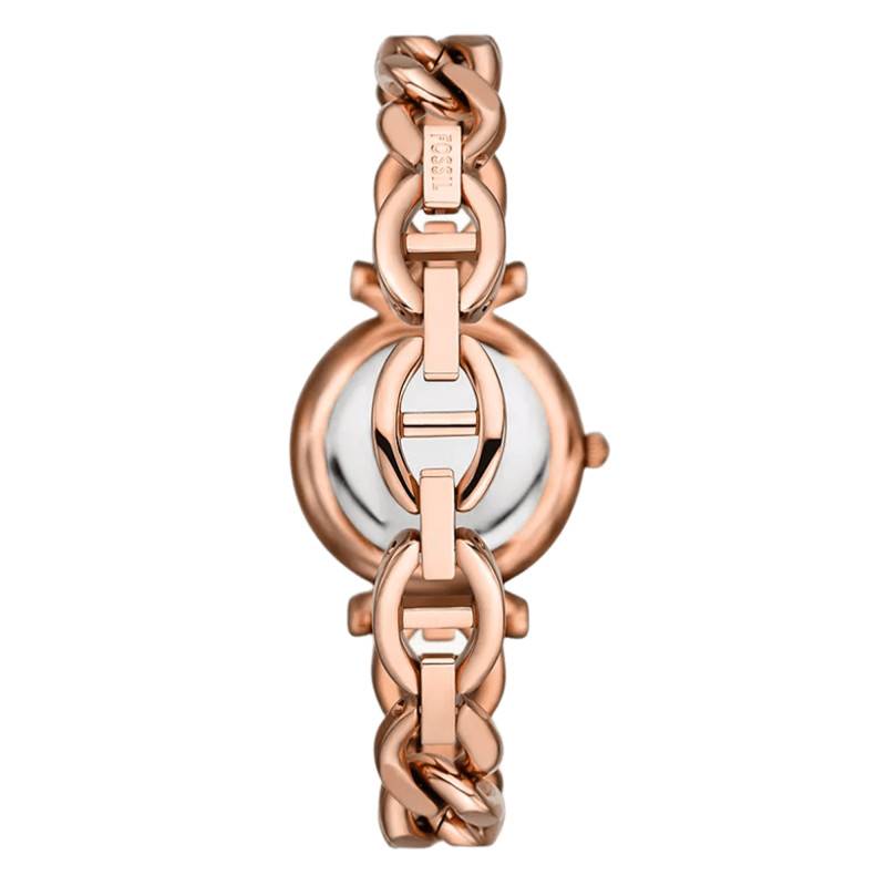 Fossil est l'une des marques d'horlogerie les plus modernes qui propose des garde-temps innovants. Elle confectionne des modèles de haute qualité, contemporains et diversifiés qui séduisent un large public. Elle vous présente cette élégante montre Carlie ES5330 destinée aux femmes modernes et gracieuses. Elle est livrée avec un boîtier parfaitement rond avec des lignes épurées et bien soignées formant un diamètre de 28 mm et une épaisseur de 7 mm. Celui-ci est conçu en acier inoxydable avec un plaquage ionique de couleur or rose rehaussé par une finition polie qui lui accorde une allure plus sophistiquée. Au-dessus de la carrure se trouve le verre minéral plat qui offre une belle vue du cadran. La couronne, quant à elle, occupe la position 3 heures et présente un crantage permettant une saisie facile lors du réglage des aiguilles. Le tout est complété par un fond emboîté de couleur argentée permettant à la montre d'avoir une étanchéité de 5 ATM.