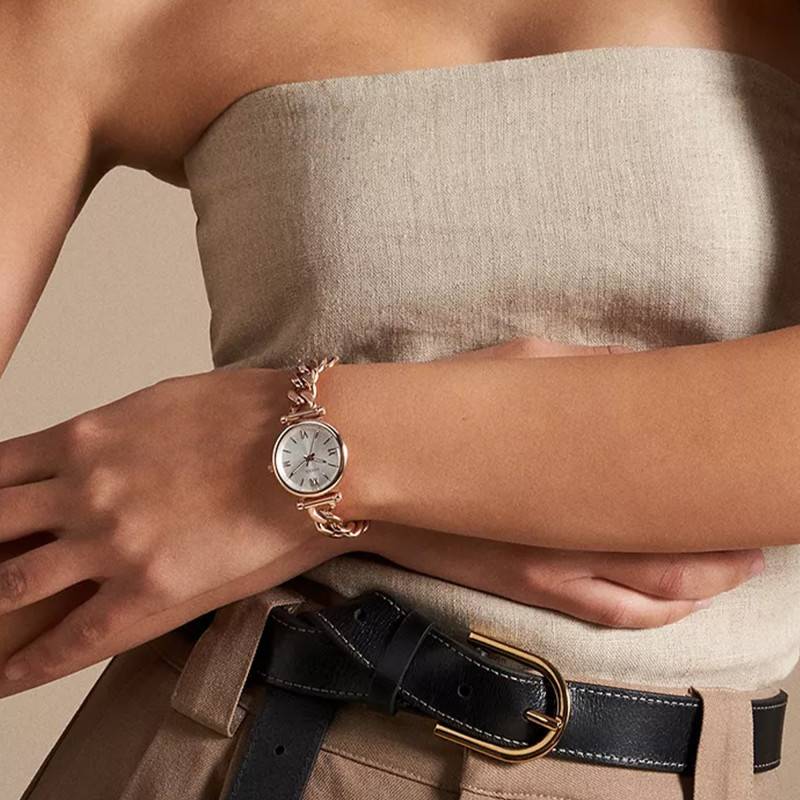 Le bracelet de cette montre est un magnifique complément d'une esthétique qui offre une allure élégante. Conçu comme un bijou, il se compose d'une chaîne gourmette réalisée en acier inoxydable et plaquée par ionisation de couleur or rose. Polie, celle-ci mesure 12 mm de largeur au niveau de l'entrecorne et se termine par un fermoir à clip. Agréable et beau à porter, ce bracelet conviendra aux poignets dotés d'une circonférence de 185 ± 5 mm.