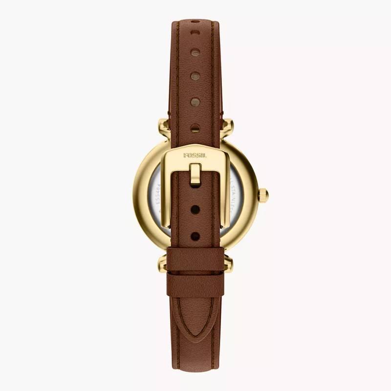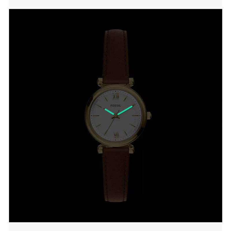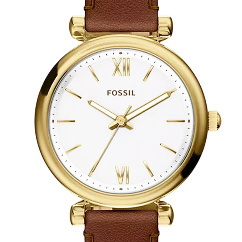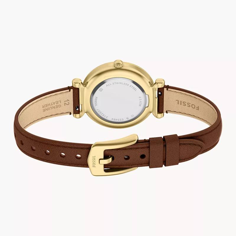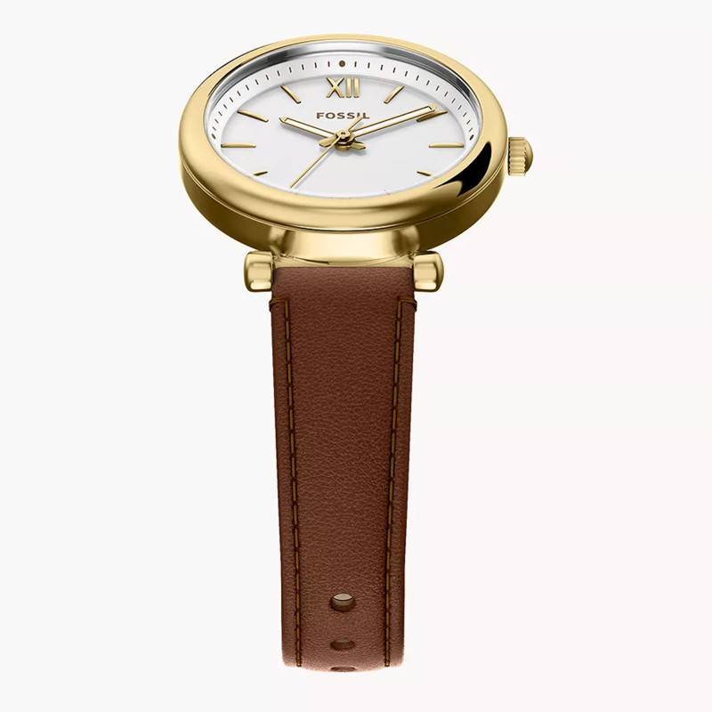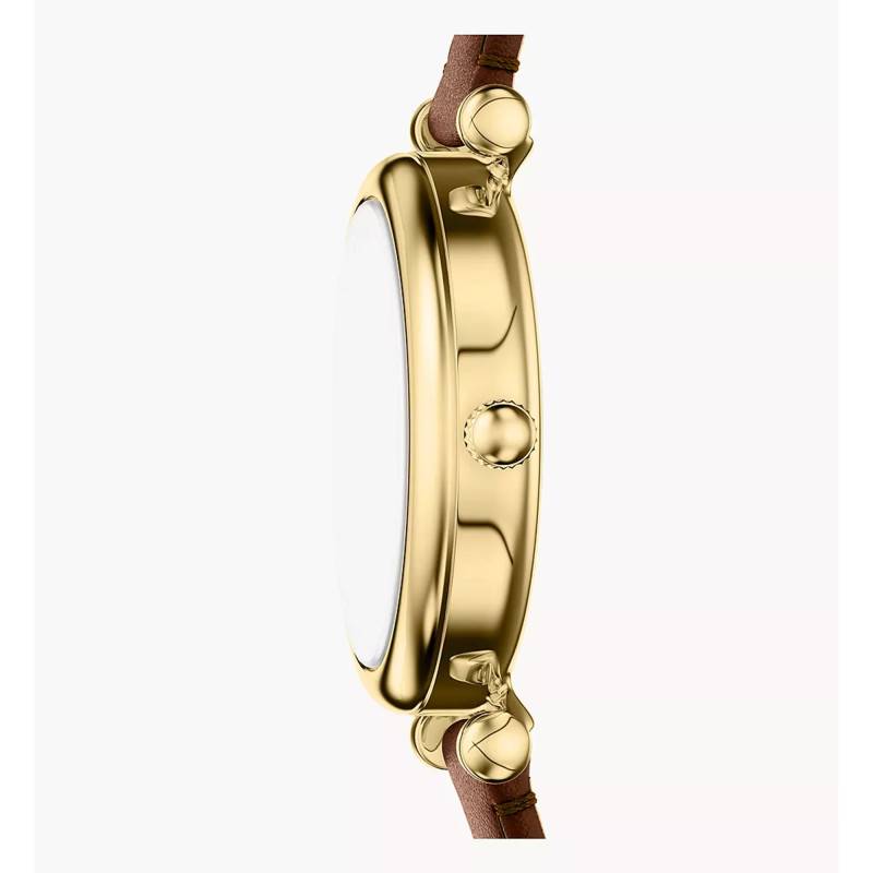 La Montre Mini Carlie de Fossil se distingue par son charme discret et sa conception soignée. Le boîtier est en acier inoxydable, renforcé par une finition PVD jaune qui accentue son éclat et sa durabilité. Avec un diamètre de 28 mm et une épaisseur de seulement 7 mm, ce garde-temps épouse parfaitement le poignet féminin, offrant une allure élégante. La forme ronde du boîtier est un classique intemporel, qui s'associe harmonieusement avec le style général de la montre. La montre est équipée d'un unique bouton remontoir situé à trois heures pour ajuster l'heure avec précision. L'ensemble est conçu pour offrir une expérience utilisateur fluide et agréable.
