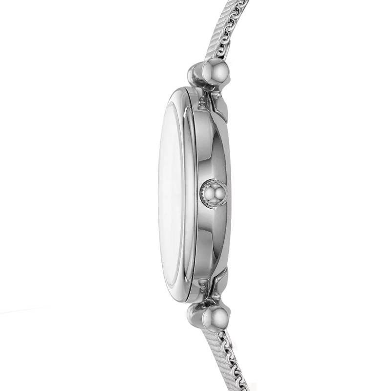 Le raffinement et l'élégance au féminin sont au rendez-vous avec la collection Carlie Mini de l'horloger Fossil. Ce modèle classique aux détails pleins de charme se compose d'un boîtier en acier inoxydable de forme ronde. Avec sa finition polie, il gardera sa couleur argentée d'origine. Il se posera avec discrétion sur les poignets féminins avec un diamètre de 29 mm. A trois heures, la couronne remontoir vous permettra d'effectuer le réglage de vos aiguilles. Puis, un verre minéral viendra surplomber le cadran pour le protéger contre tout risque de détérioration. Enfin, cette petite montre possède un fond de boîte emboîté pour garantir une étanchéité jusqu'à 50 mètres.