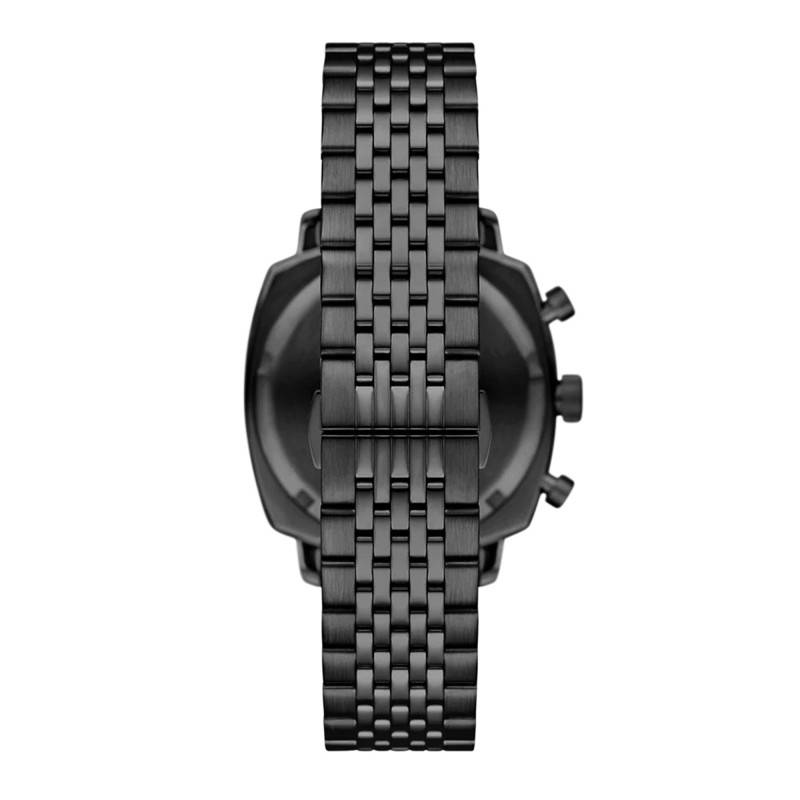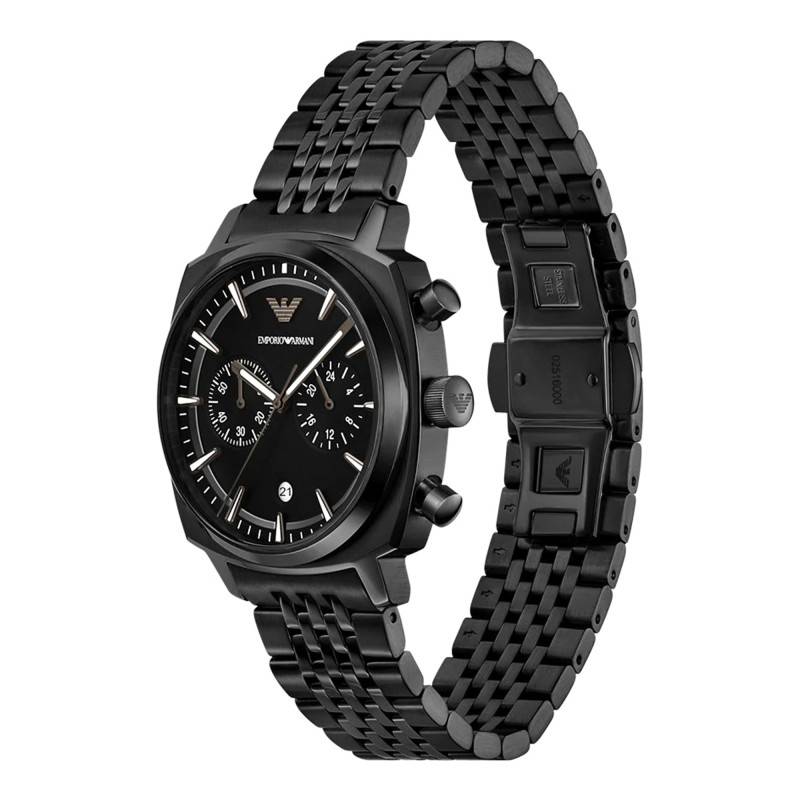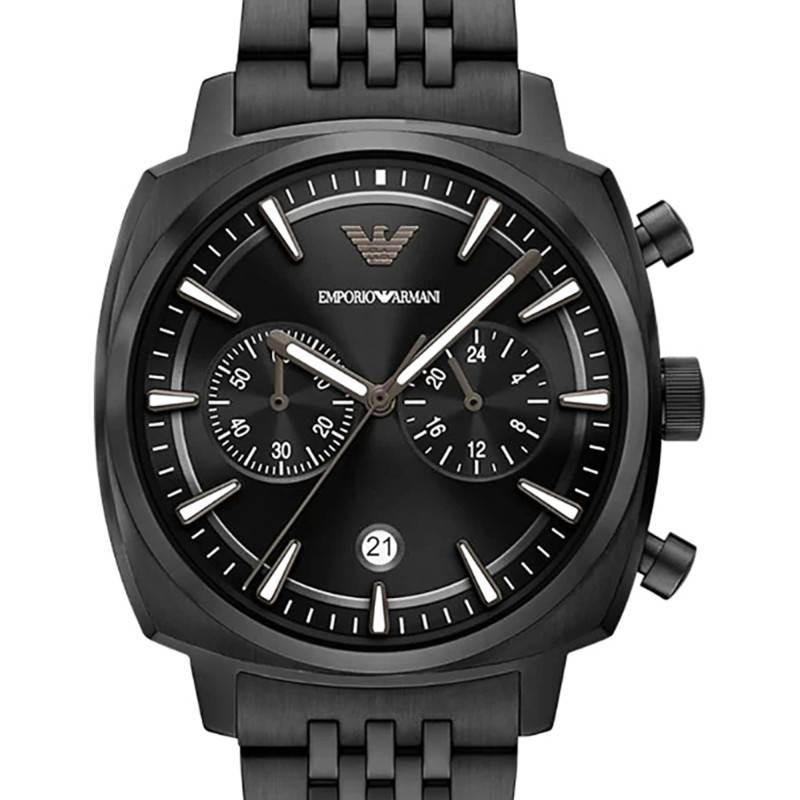 La montre Emporio Armani arbore un style moderne grâce à son boîtier en acier inoxydable recouvert d'un traitement PVD noir. Sa silhouette coussin de 40 mm de diamètre et 13 mm d'épaisseur confère une présence élégante au poignet, tout en conservant une dimension classique. L'habillage mat brossé accentue le caractère raffiné de cette pièce horlogère. Le verre bombé minéral protège le cadran tout en apportant une légère touche vintage. Ce garde-temps est équipé d'un fond vissé garantissant robustesse et durabilité. Vous trouverez deux boutons poussoirs et un bouton remontoir sur le côté droit.