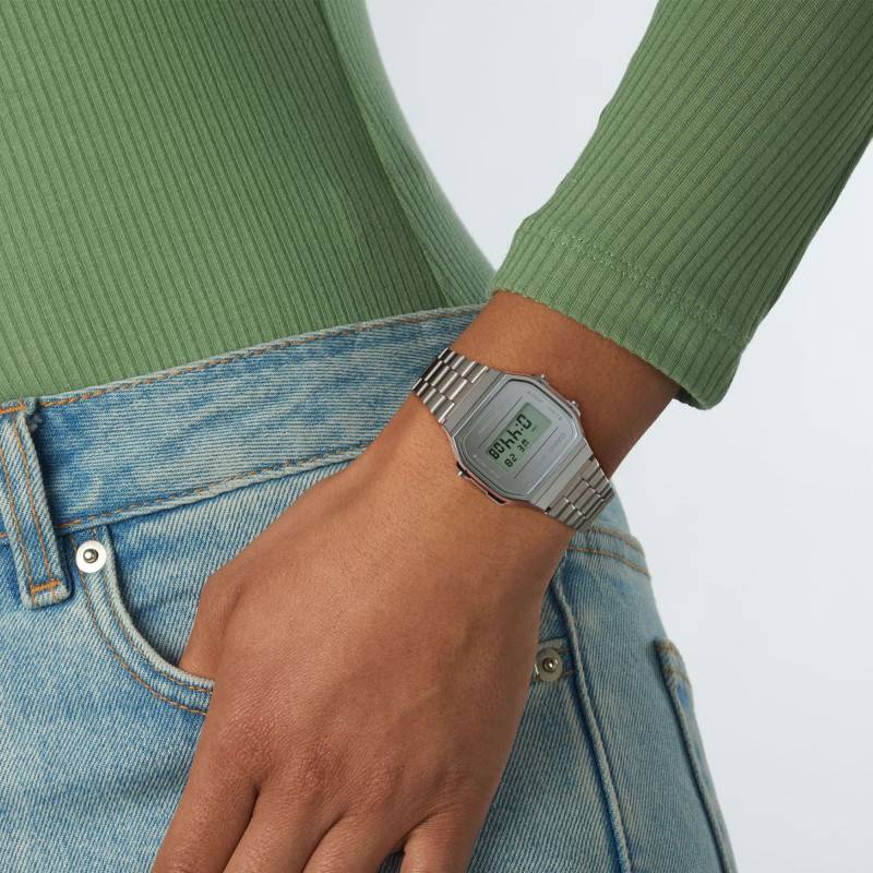 Ce garde-temps, signé Casio, se distingue par sa finition façetée argentée. Sur son écran principal, il affiche en numérique les fonctions heures, minutes, secondes en chiffres arabes. La date vient s'installer au-dessus de l'heure.