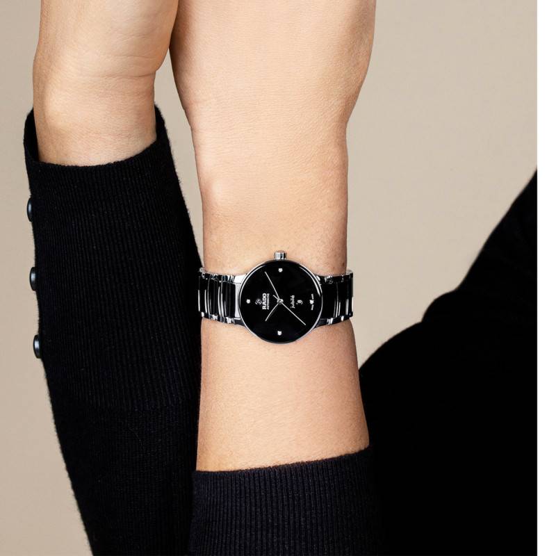 La montre Centrix Automatic Diamonds est une merveille d'horlogerie moderne, notamment grâce à son emploi harmonieux de matières premiums telles que l'acier inoxydable et la céramique. Le boîtier rond possède un fini soigneusement poli pour un éclat supplémentaire, soulignant parfaitement l'intégration d'éléments contemporains et de raffinement classique. Ce garde-temps arbore un poids net de 85 g, une épaisseur optimisée à 8,90 mm, et un diamètre délicat de 30,50 mm à l'image du style féminin qu'elle incarne avec brio.