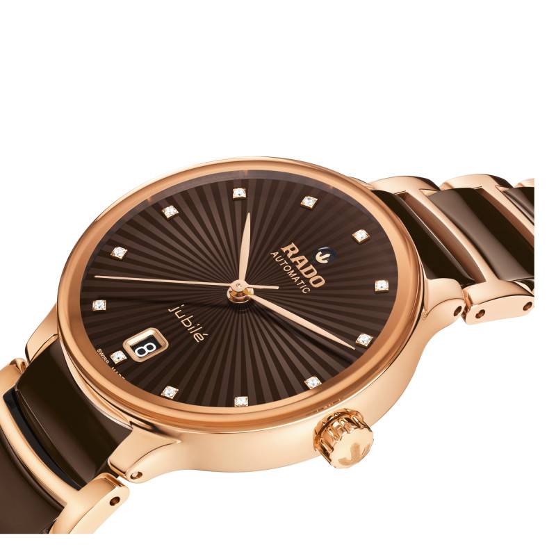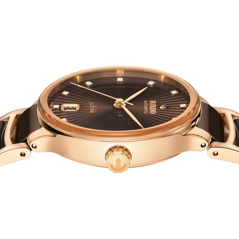 Le cadran de la montre Rado Centrix Automatic Diamonds est tout simplement magnifique. Habillé d'une teinte marron subtile, le cadran présente une finition striée qui joue délicatement avec la lumière. Les index en diamant apportent une dimension de luxe et de finesse, tout en servant de repères visuels élégants pour la lecture de l'heure. Le cadran inclut des aiguilles fines et sophistiquées qui indiquent heures, minutes et secondes avec précision. À 6 heures, un guichet date se détache subtilement sans nuire à l'harmonie globale du design. Ce positionnement, à la fois pratique et raffiné, invite à une lecture rapide et aisée.