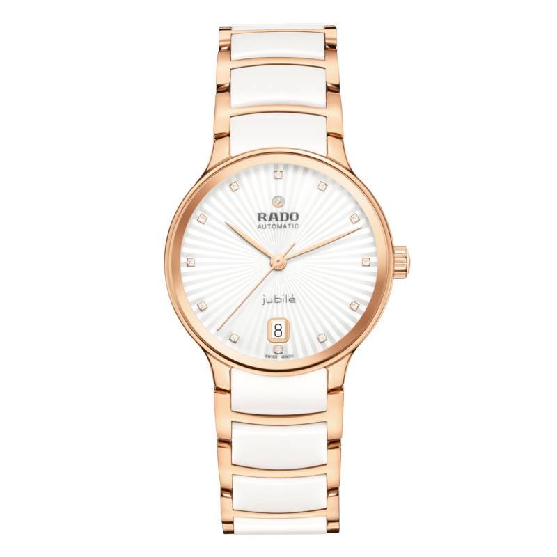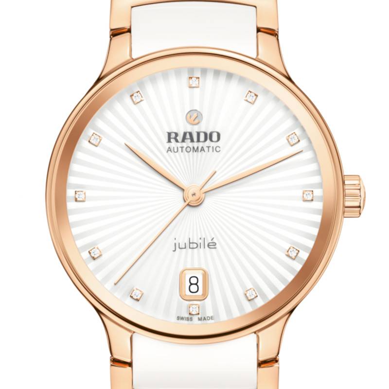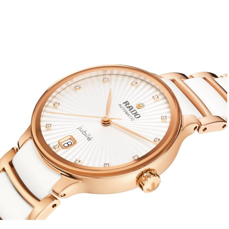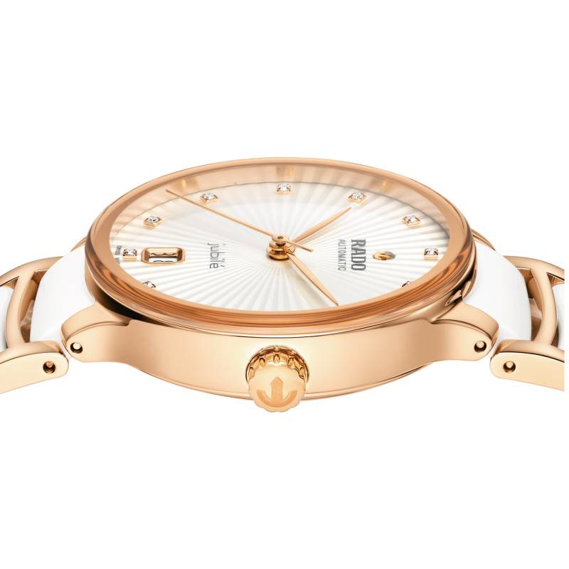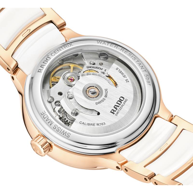La montre Centrix Automatic Diamonds de Rado se distingue par une silhouette fluide et contemporaine. Conçue pour les femmes, cette montre présente un boîtier rond de 35 mm, une dimension qui s'adapte parfaitement au poignet féminin. Elle est fabriquée en acier inoxydable avec une finition PVD or rose, conférant une allure chic et moderne. Son poids de 85 grammes offre un confort optimal, combinant légèreté et solidité. Le fond du boîtier est emboité mais transparent, permettant d'admirer la précision du mouvement suisse à l'œil nu, une caractéristique qui attire les amateurs de haute horlogerie.